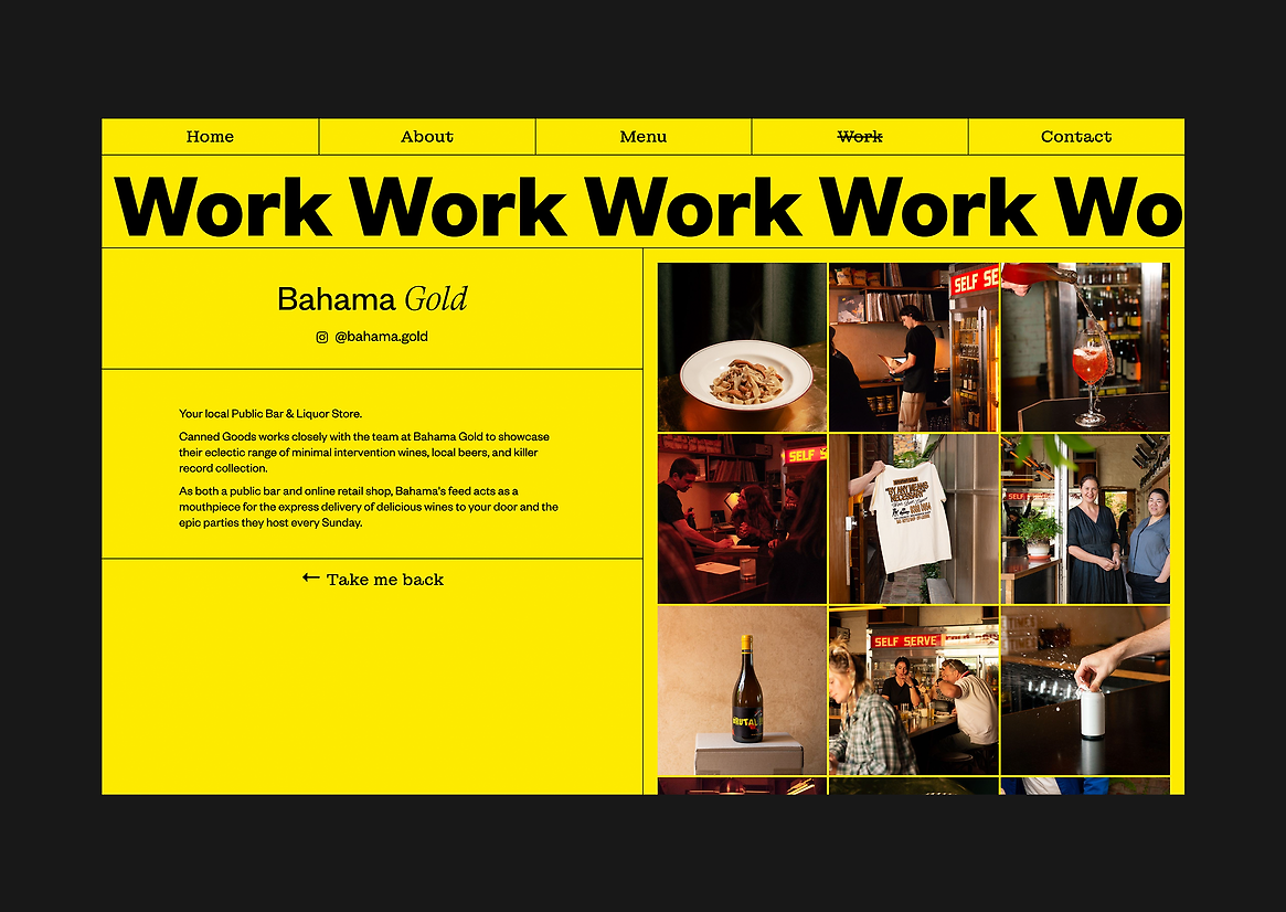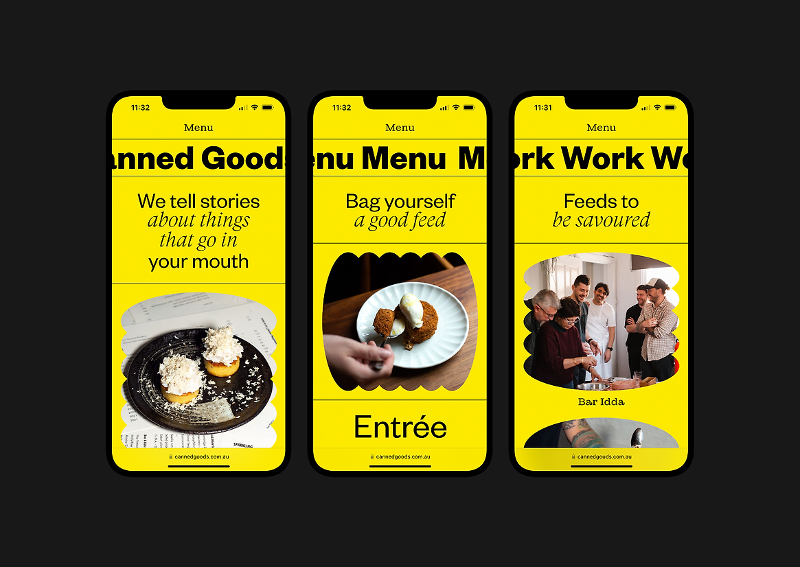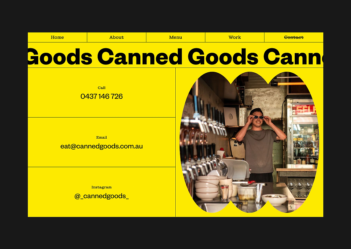 The Canned Goods site needed to translate the no-frills identity into the digital realm, maintaining the everyday honesty of the brand. We made use of the pared back palette and a delicately-strained balance between scale and negative space, jamming the brands goods into each page like ingredients on a busy kitchen shelf. Meanwhile, scrolling titles pass you by like your weekly grocery purchase at the supermarket conveyor belt. Consider this an honest portrayal of a passionate artist - one with a focused offering and a deep, deep love of food and the occasional Negroni.