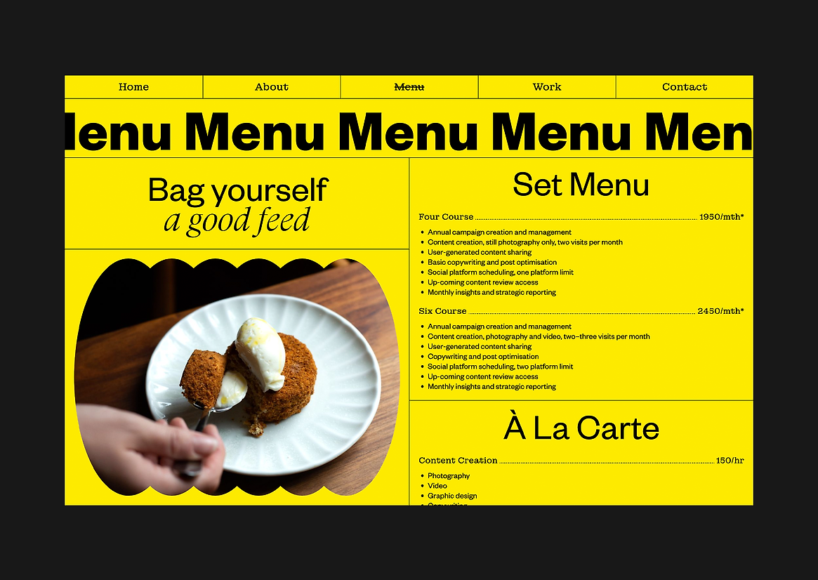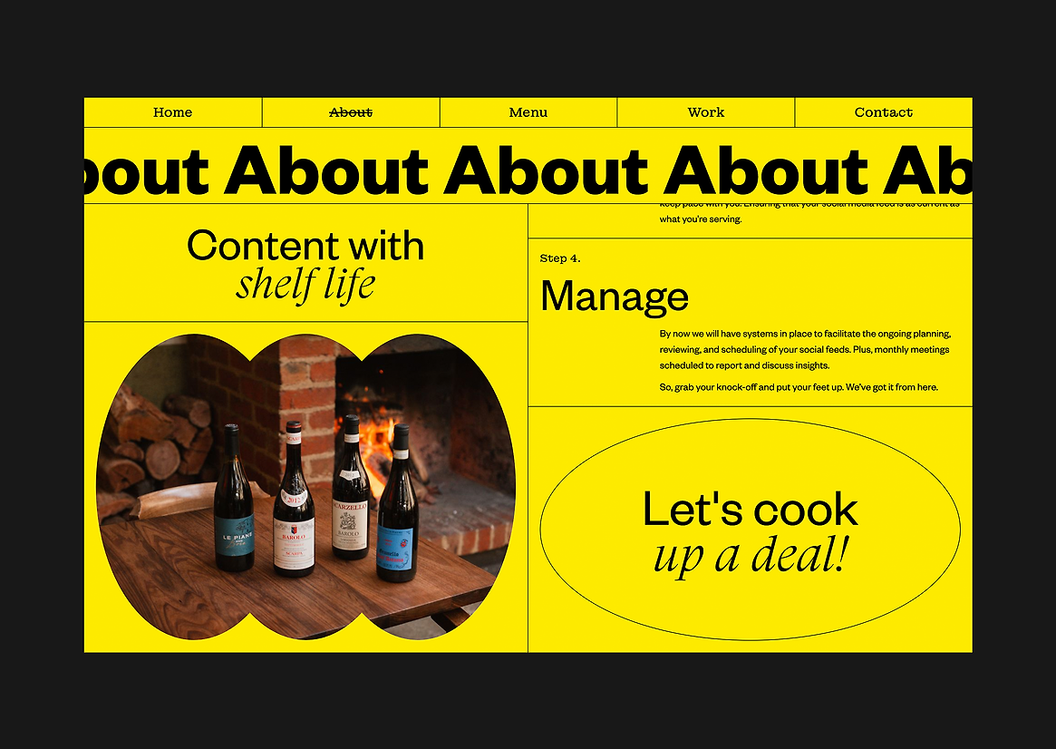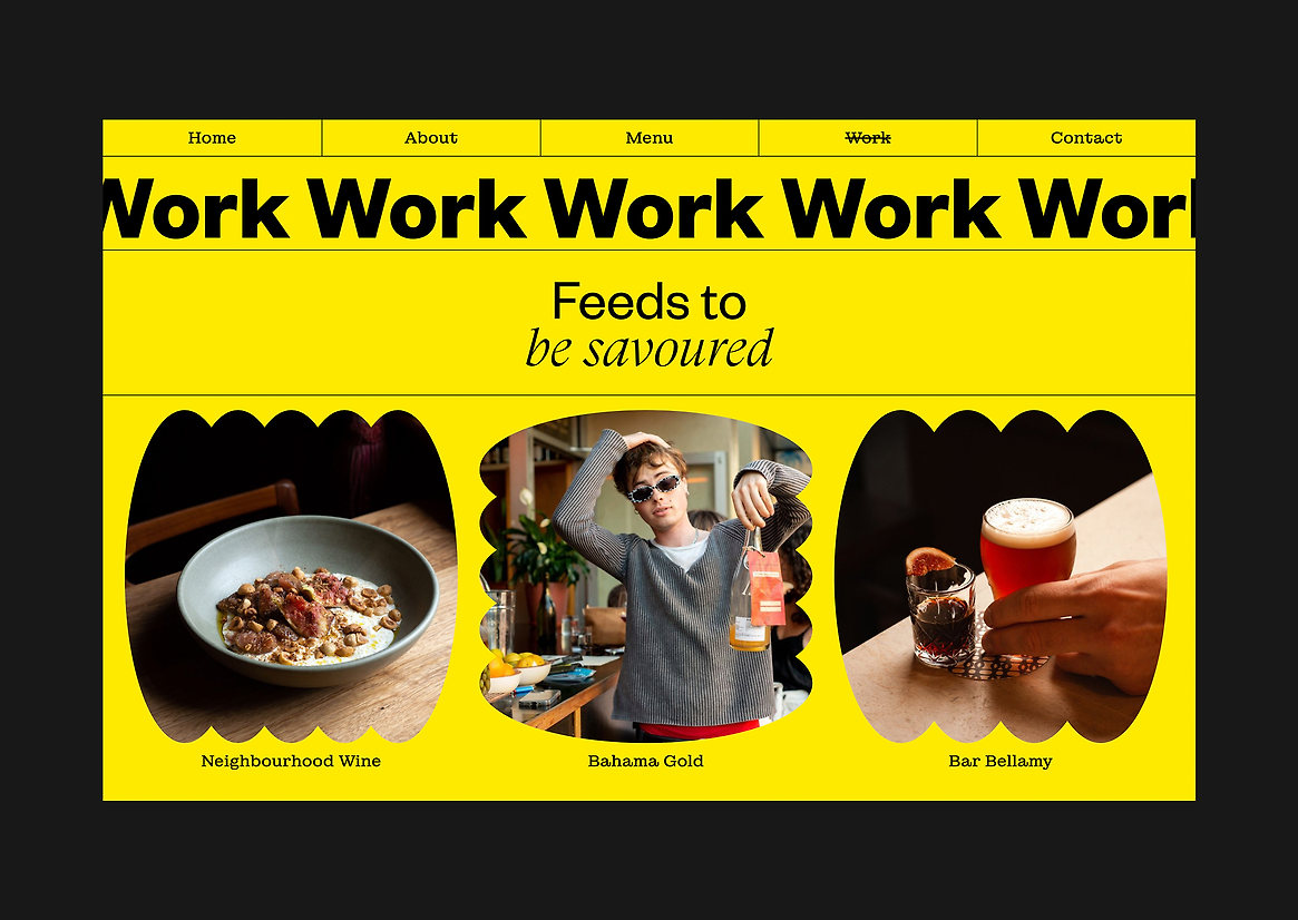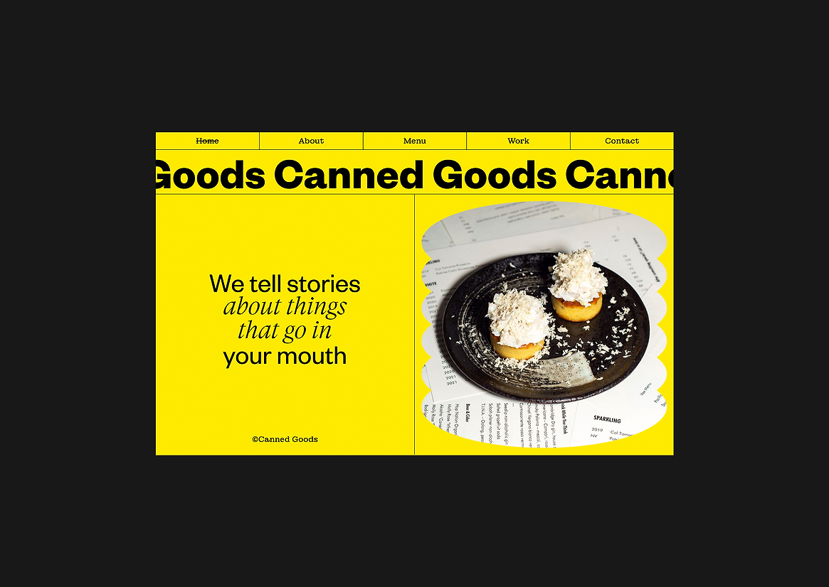 The Canned Goods site needed to translate the no-frills identity into the digital realm, maintaining the everyday honesty of the brand. We made use of the pared back palette and a delicately-strained balance between scale and negative space, jamming the brands goods into each page like ingredients on a busy kitchen shelf. Meanwhile, scrolling titles pass you by like your weekly grocery purchase at the supermarket conveyor belt. Consider this an honest portrayal of a passionate artist - one with a focused offering and a deep, deep love of food and the occasional Negroni.