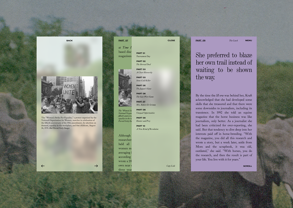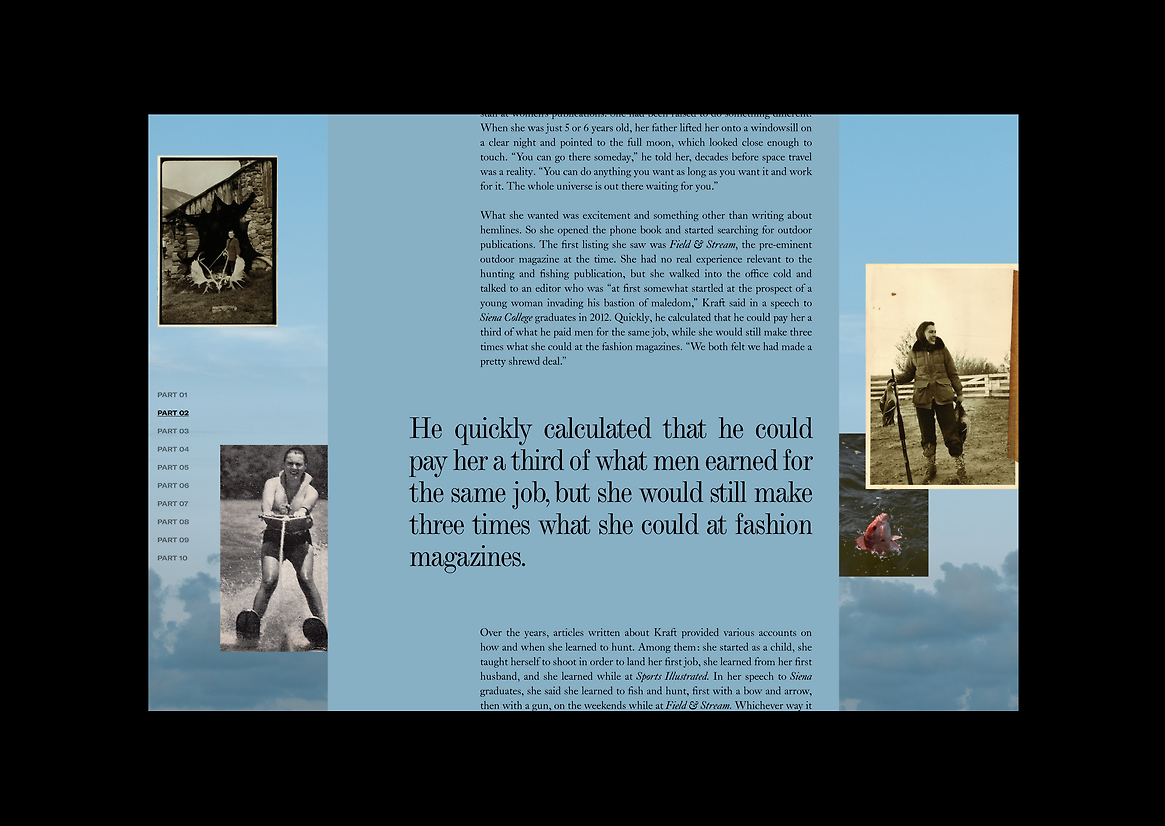 The Catch is a digital storytelling site for Long Lead that resurrects the extraordinary legacy of Virginia Kraft, a pioneering sports journalist from the golden age of publishing. Our challenge was to create an immersive editorial experience showcasing Kraft's groundbreaking 26-year career at Sports Illustrated while prompting reflection on the complexities of being a trailblazer. We crafted a layered, interactive experience mirroring the depth of Kraft's character and career. Drawing inspiration from mid-century Sports Illustrated magazines, we bridged vintage print aesthetics with modern digital storytelling. The design uses layering as a central motif, allowing users to uncover different aspects of Kraft's legacy as they navigate the site. Interactive elements invite users to engage deeply with archival content, comparing Kraft's original reporting with modern reflections. This approach encourages a nuanced understanding of her complex legacy. The Catch challenges conventional narratives about pioneering women by presenting a portrait that embraces contradictions. It contributes to a reassessment of women's roles in journalism history, serving not just as a tribute to Kraft, but as a call to action to celebrate complex stories of unconventional female trailblazers across all fields.