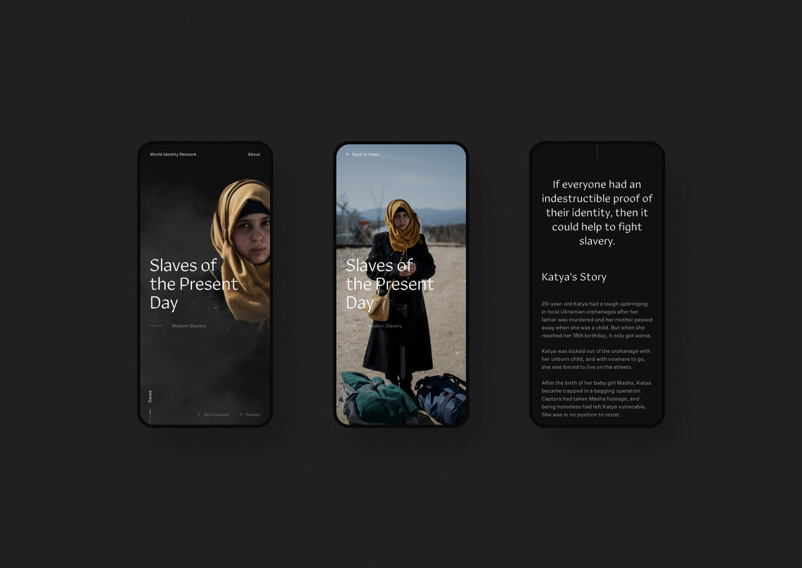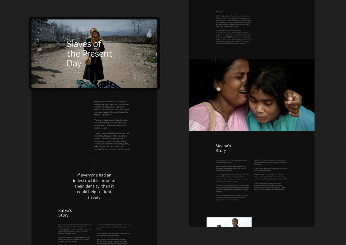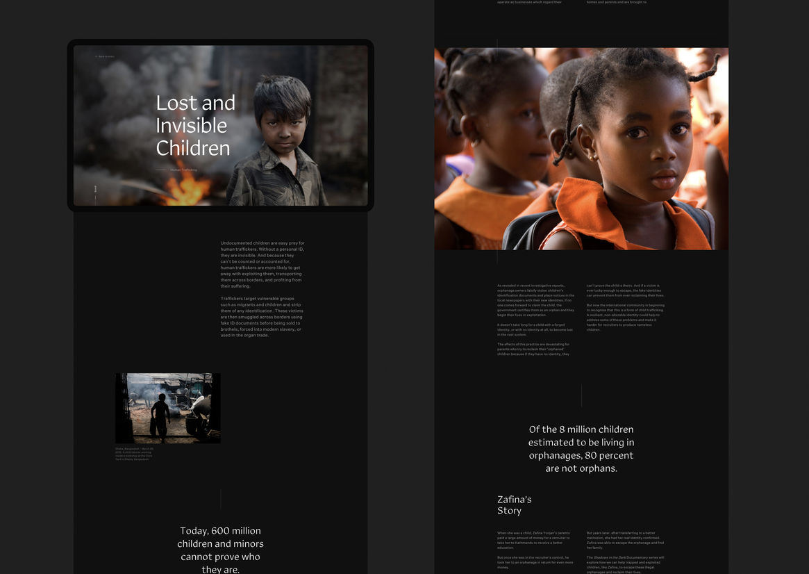 World Identity Network represents digital story telling at its best. A conceptually powerful way to communicate a brutal and abstract reality. Bringing to light a significant global issue that affects a large percentage of humanity. As you navigate through the chapters the scrolling interactions were unexpected and pulls you in to read more.