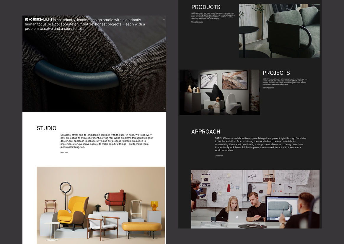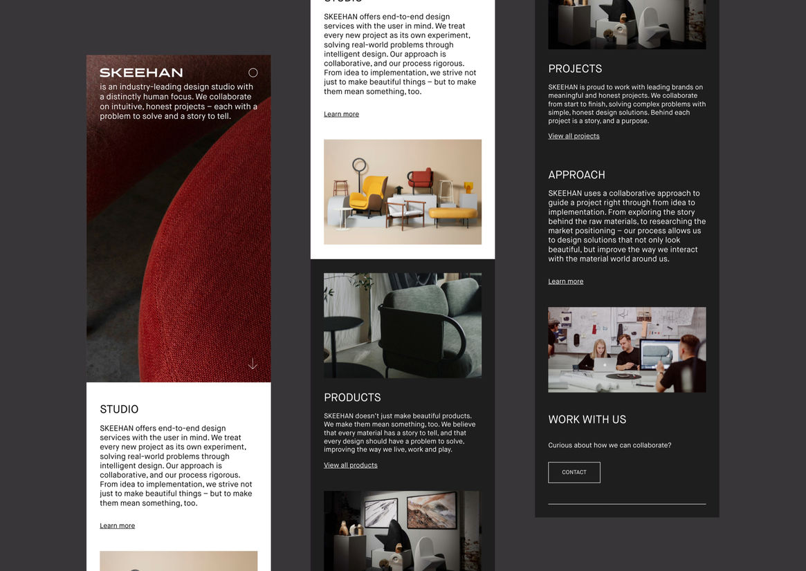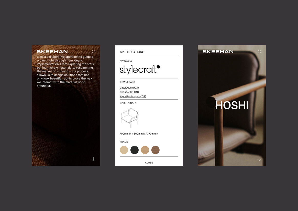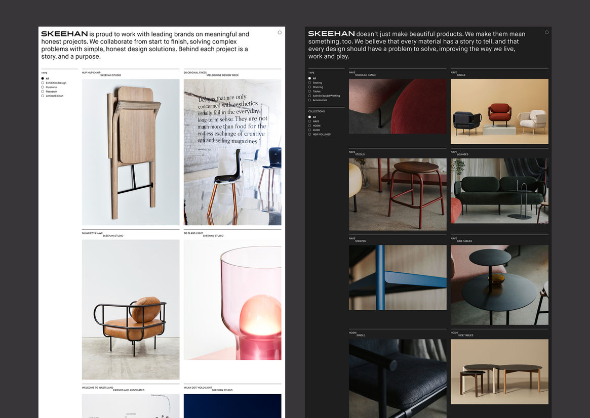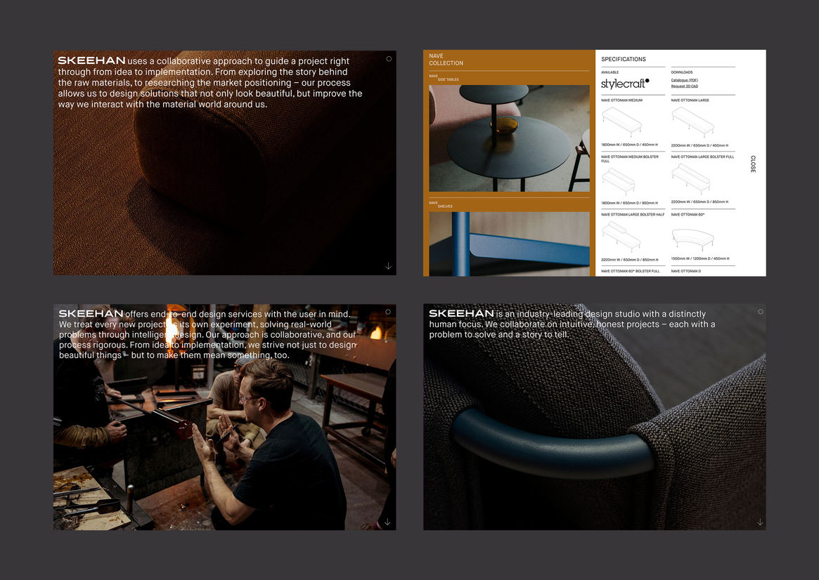 SKEEHAN is an Australian design studio specialising in high-end furniture and designs for commercial environments. The purpose of this project was to build a website which repositions the evolving brand by expressing the diversity of their projects, encouraging collaboration and communicating the value of their offerings to the Australian-made market. Paramount to the brand’s success is their ability to effectively communicate to prospective clientele their vision to reconnect people to the material world around them. The developed approach emphasises innovation and partnerships, promotes engagement across brand touchpoints and facilitates collaboration between designer and client throughout various phases of product development. The concept explores the team’s unique and restrained approach to brand, research, positioning and materiality. The website has been transformed into a valuable tool for creatives to promote a transparent process that guides projects through a constant exchange of ideas.