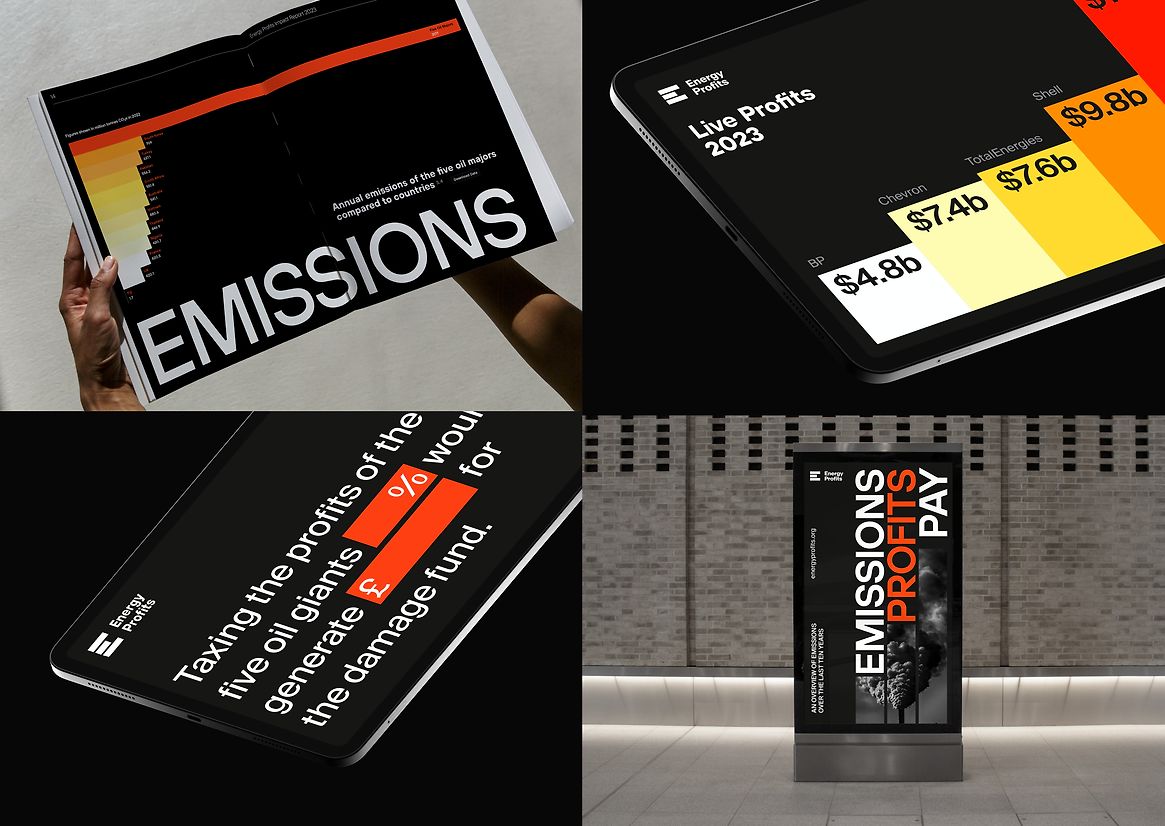 The key to the concept was bold data visualisation of the shocking statistics, using motion and animation to bring them to life and make them easy to digest. This translates across the entire brand including the logomark, with the ‘E’ icon representing growth in terms of profit, remuneration, emissions, and damage. The colour palette uses a combination of harsh black and white combined with the red, orange, and yellow hues to symbolise the planet heating up and the increasingly growing climate destruction. Combined with clean type and powerful photography, it makes for uncomfortable reading that's hard to ignore.