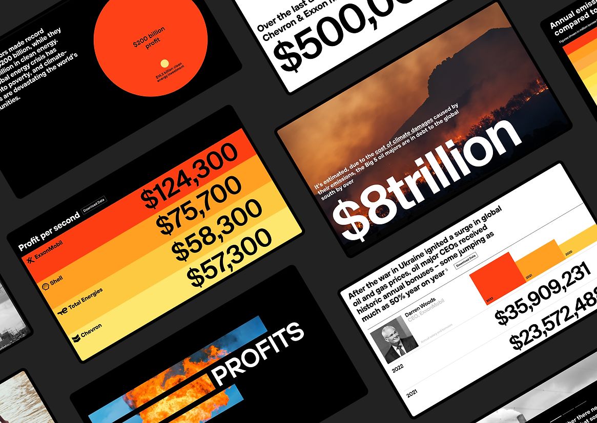 As a result, we created the ‘Energy Profits’ brand and website. A hard-hitting and visually compelling site that brings to life the uncomfortable and shocking statistics, highlighting just how much oil companies and their CEOs are profiting at the expense of the planet.
