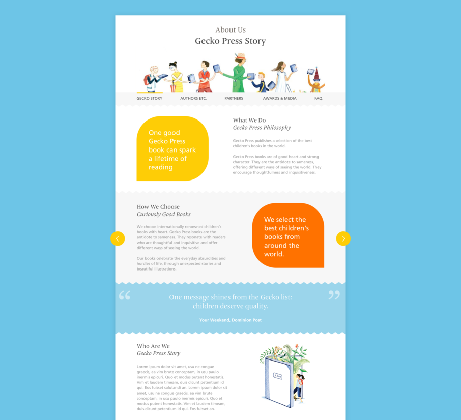 Digital Digital Campaigns Digital Products E-Commerce Websites (new 2024) Game Design Installation & Exhibition Large Scale Websites Small Scale Websites Student Digital User Experience (archived 2022) Animation Digital — formerly Interactive (2010–2019) Film Graphic Moving Image (archived 2025) Product Social Good Award Spatial Toitanga Value of Design Award User Experience Award (archived 2019) All categories Digital Campaigns Digital Products E-Commerce Websites (new 2024) Game Design Installation & Exhibition Large Scale Websites Small Scale Websites Student Digital User Experience (archived 2022) All years 2025 2024 2023 2022 2021 2020 2019 2018 2017 2016 2015 2014 2013 2012 2011 2010 Studio A-Z Kope Studio Gecko Press Finalist 2017 Small Scale Websites Credits Pou Auaha / Creative Directors Shanshan Zhou, Julia Marshall Ringatoi Matua / Design Director Shanshan Zhou Kaitautoko / Contributor Dartworks Client Gecko Press