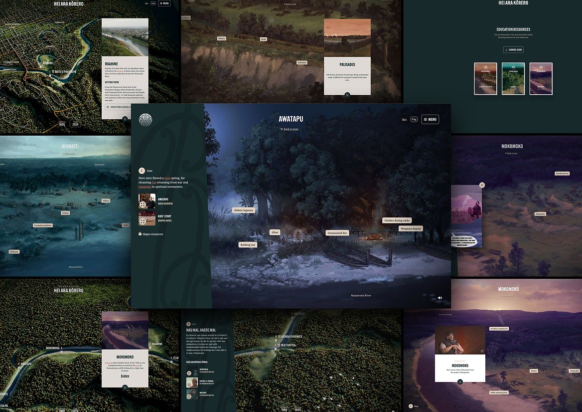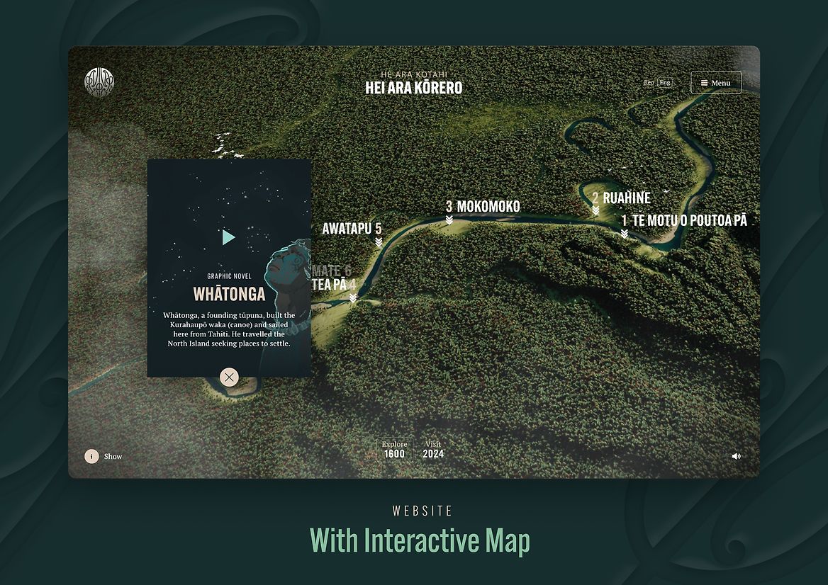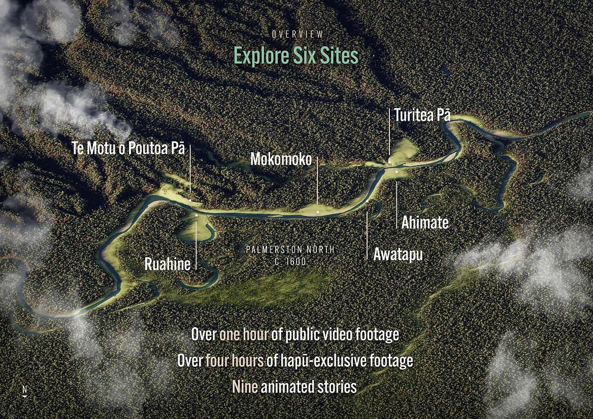 The experiential website (heiarakorero.nz) features a beautiful, 3D-modelled aerial view of Palmerston North as it would have looked c.1600. By clicking on each site, users can explore each place through edited oral histories, family-friendly graphic novels, and detailed illustrated recreations of each site.