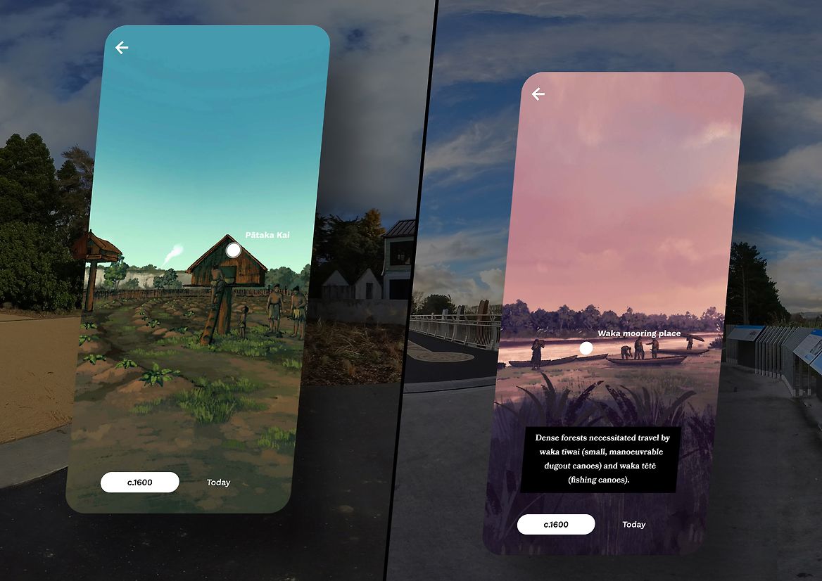 To explore sites on the mobile phone tour (hak.nz/tour), visitors scan QR codes on branded markers, to access audio overviews, articles and edited oral histories with filmed video recreations. The 360˚ augmented reality scenes reimagine the sites as they would have once looked and been utilised – including pā sites, kāinga, māra, and places for traditional ceremonies. Labelled hotspots interpret key people, items, and places in the scene.