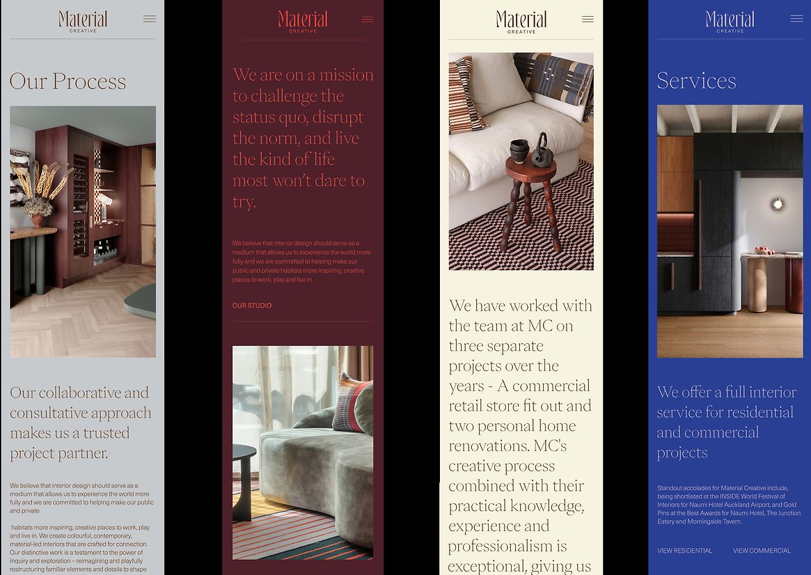 Material Creative is renowned for its signature use of colour. As you scroll, vibrant colours shift as you reach different points of the page. Changing colour combinations decorate new ‘rooms’ of information throughout the navigation journey. Adding to the dynamic landscape are light touch, scroll-driven transitions and animations achieved using CSS and JS.