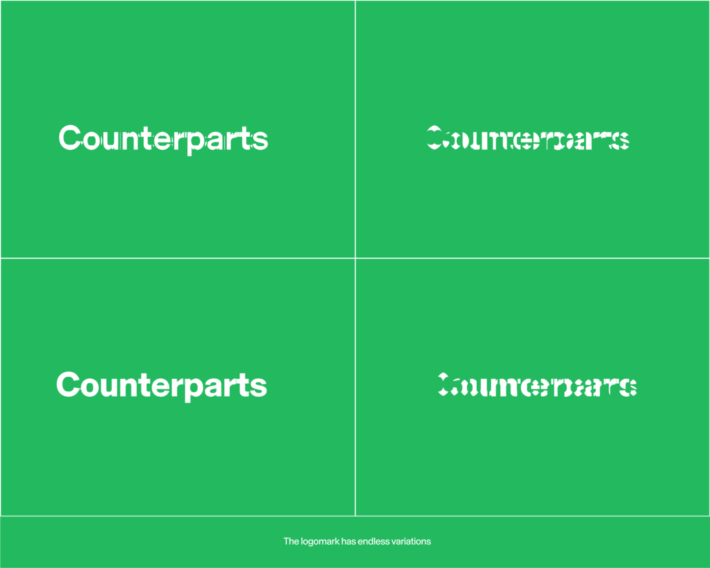 The logomark was created by overlapping the word “Counterparts” and rendering the intersecting shapes to create new letterforms, which change with input from the user, becoming more or less abstract as the user moves their cursor left and right.