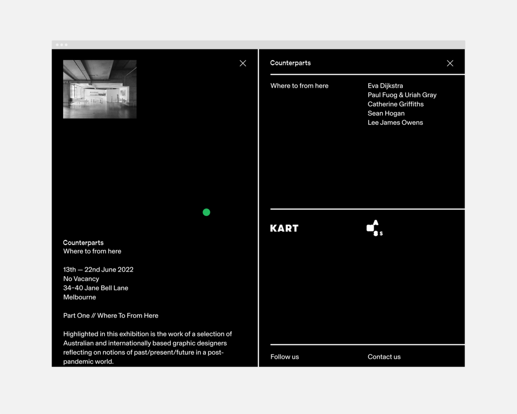 We created the identity and designed the website for an upcoming exhibition called “Counterparts”. The exhibition and conversation series presents the work of six prominent designers and explores the intersection of their personal and professional practices.