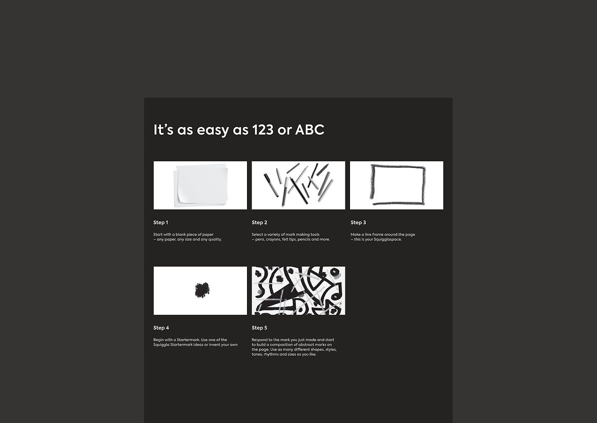 The Squiggla brand aims to be accessible and non-threatening to a broad audience, young and old alike. This is because many people decide early in life that they ‘can’t draw’ and therefore ‘aren’t creative’. The brand lowers the barrier to trying, framing the variety of Squigglaworks without competing with them. The complexity of the works dictated a simple, purposeful brand solution providing structure and meaning.