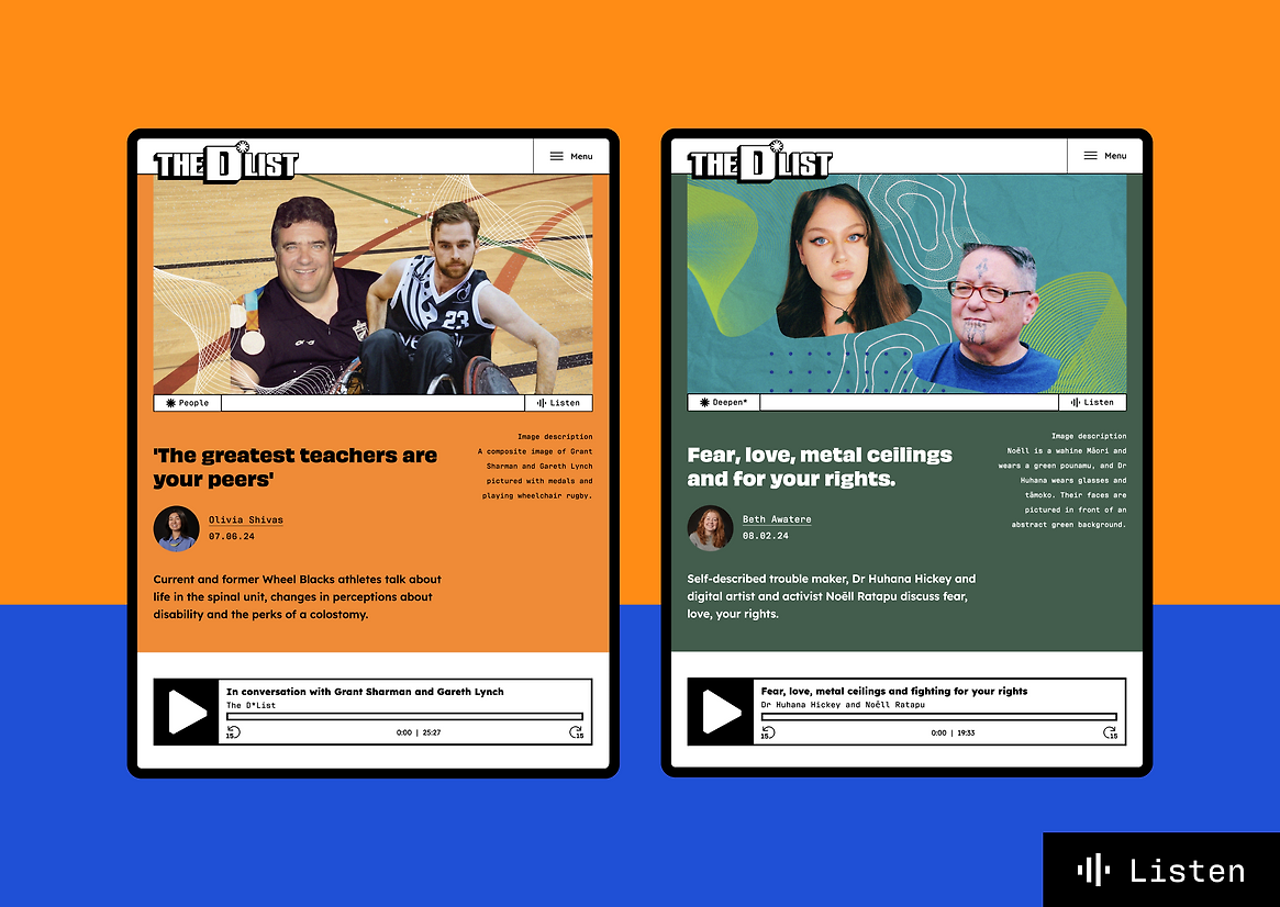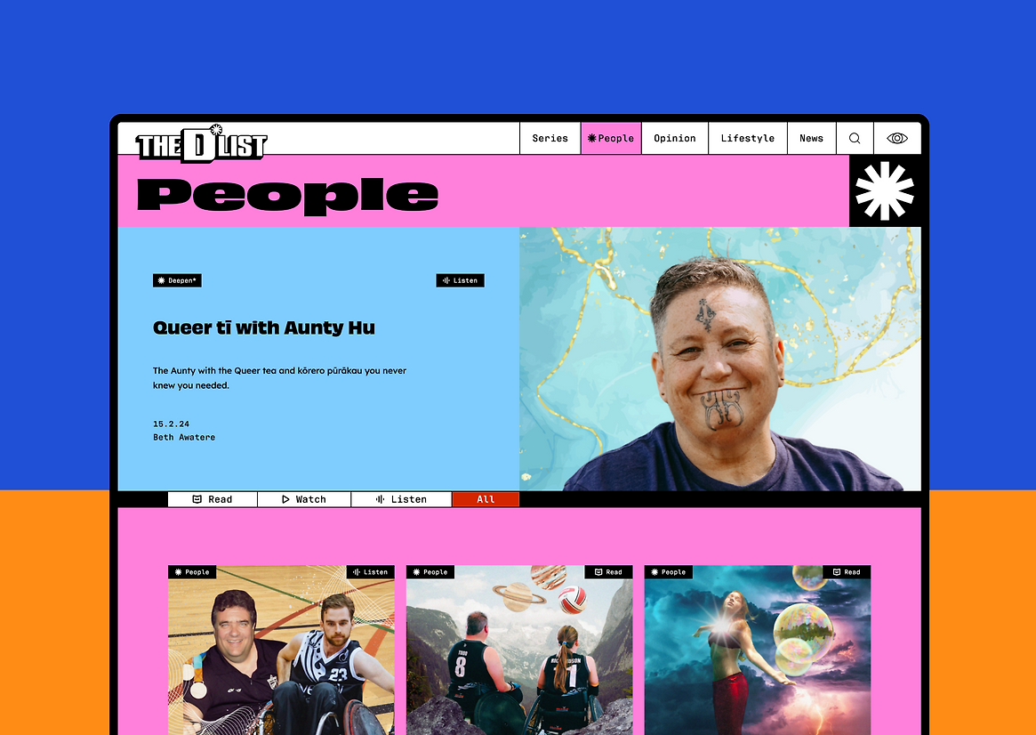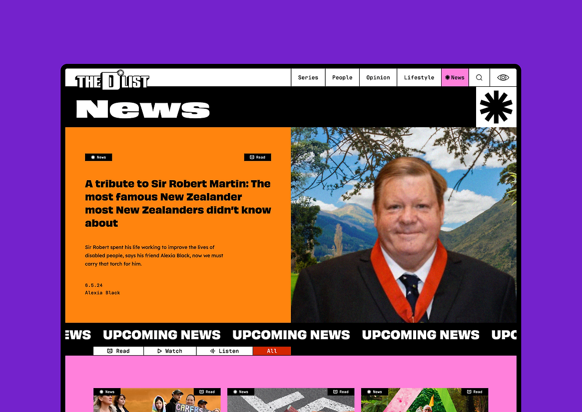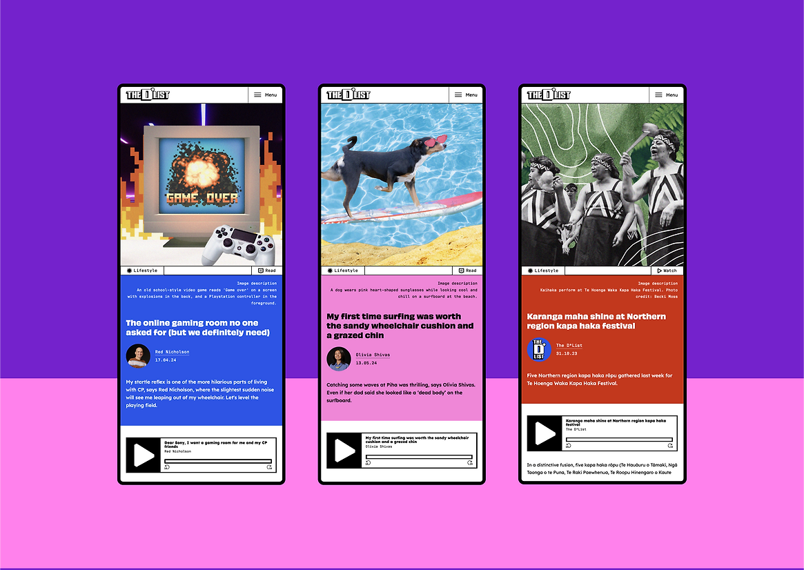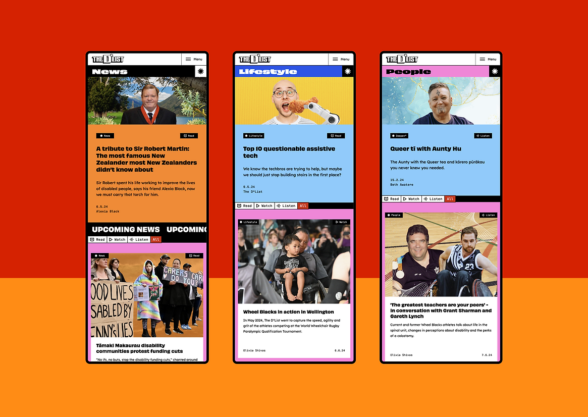 Digital Digital Campaigns Digital Products E-Commerce Websites (new 2024) Game Design Installation & Exhibition Large Scale Websites Small Scale Websites Student Digital User Experience (archived 2022) Animation Digital — formerly Interactive (2010–2019) Film Graphic Moving Image (archived 2025) Product Social Good Award Spatial Toitanga Value of Design Award User Experience Award (archived 2019) All categories Digital Campaigns Digital Products E-Commerce Websites (new 2024) Game Design Installation & Exhibition Large Scale Websites Small Scale Websites Student Digital User Experience (archived 2022) All years 2025 2024 2023 2022 2021 2020 2019 2018 2017 2016 2015 2014 2013 2012 2011 2010 Studio A-Z NV Interactive 44 Curative 25 The D*List 2024 Small Scale Websites Credits Ringatoi Matua / Design Director Nicola Holmes Ngā Kaimahi / Team Members Josh Pfeiler, James Norton, Mark Delaney, Jon Whitehead Client The D*List Description: The D*List is a bold, disability-led online magazine in Aotearoa that amplifies disabled voices, fosters community, and challenges ableism.