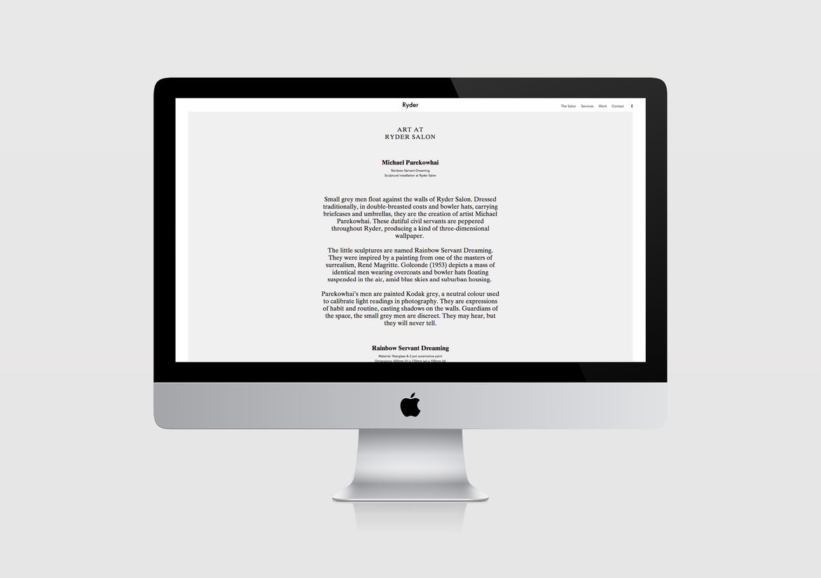 Digital Digital Campaigns Digital Products E-Commerce Websites (new 2024) Game Design Installation & Exhibition Large Scale Websites Small Scale Websites Student Digital User Experience (archived 2022) Animation Digital — formerly Interactive (2010–2019) Film Graphic Moving Image (archived 2025) Product Social Good Award Spatial Toitanga Value of Design Award User Experience Award (archived 2019) All categories Digital Campaigns Digital Products E-Commerce Websites (new 2024) Game Design Installation & Exhibition Large Scale Websites Small Scale Websites Student Digital User Experience (archived 2022) All years 2025 2024 2023 2022 2021 2020 2019 2018 2017 2016 2015 2014 2013 2012 2011 2010 Studio A-Z Osborne Shiwan 41 Ryder Finalist 2014 Small Scale Websites Credits Pou Auaha / Creative Director Lloyd Osborne Kaitautoko / Contributor Nadia Aftimos Client Ryder Salon