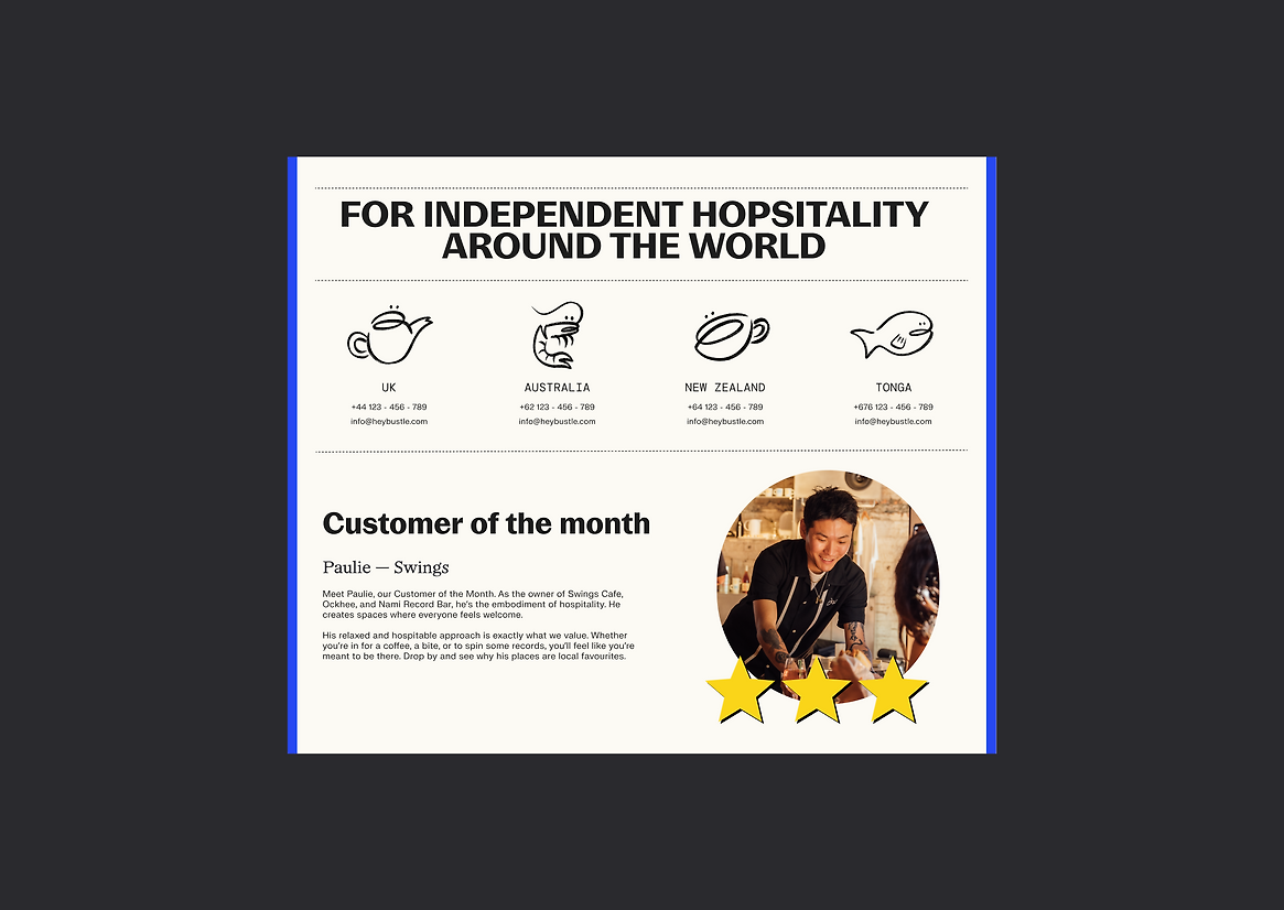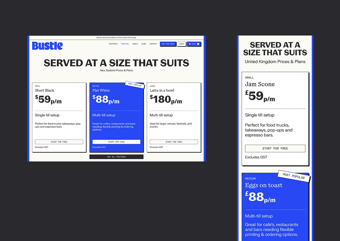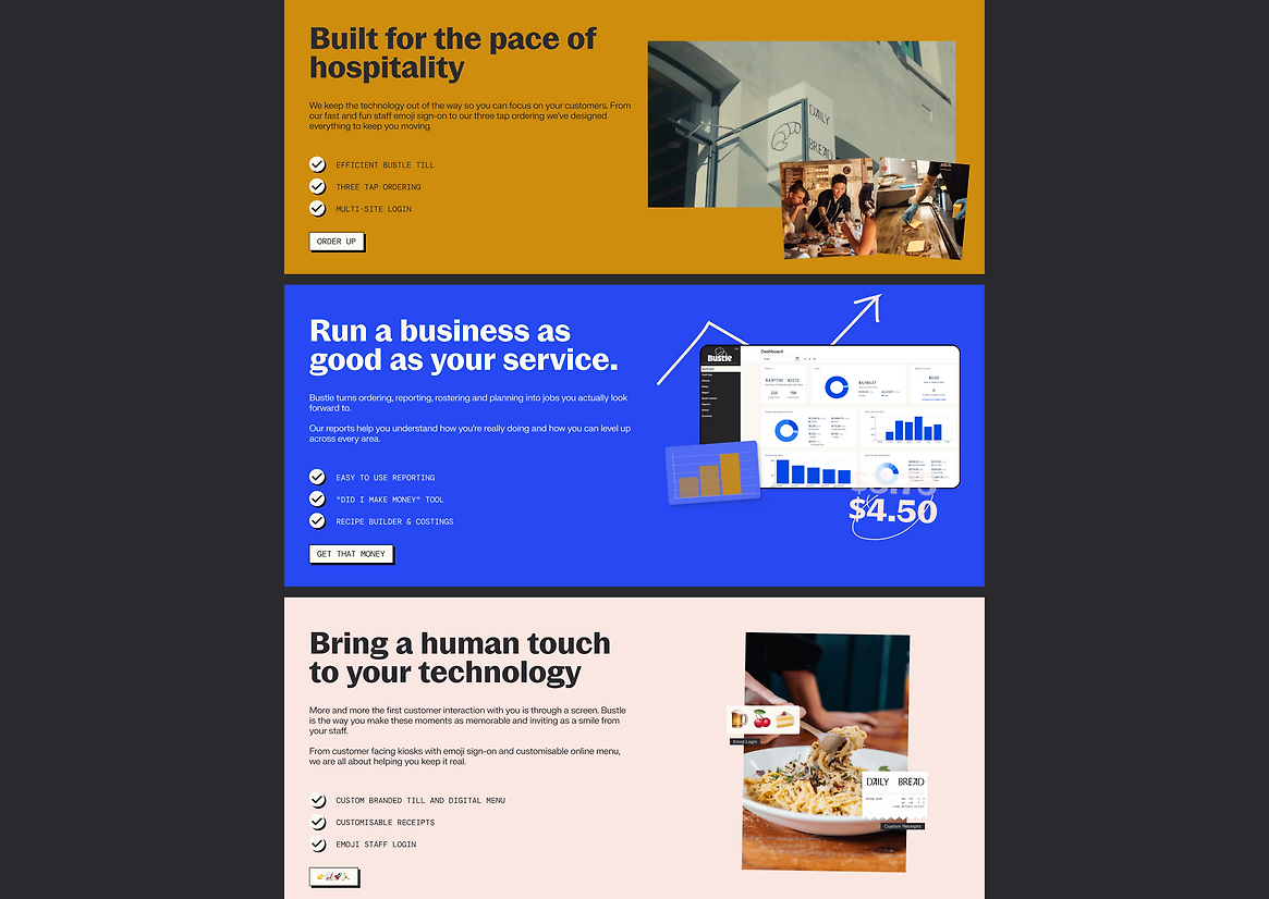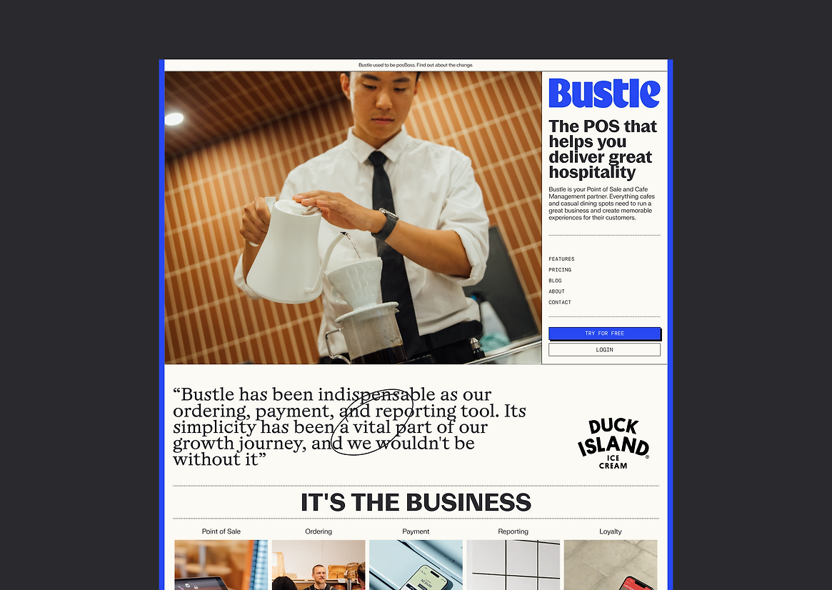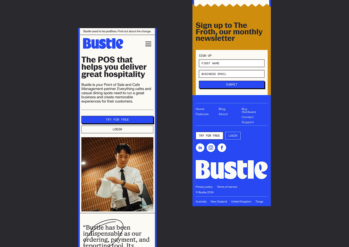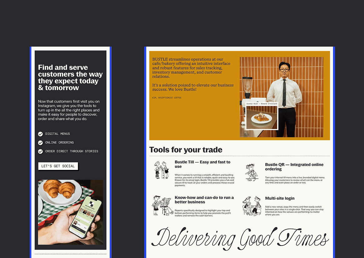 The goal for the brand and website was to become synonymous with Bustle’s hero customers, to look, feel and behave more like a hospo brand than a generic software product, and be known by all as the best way to run a hospo business.