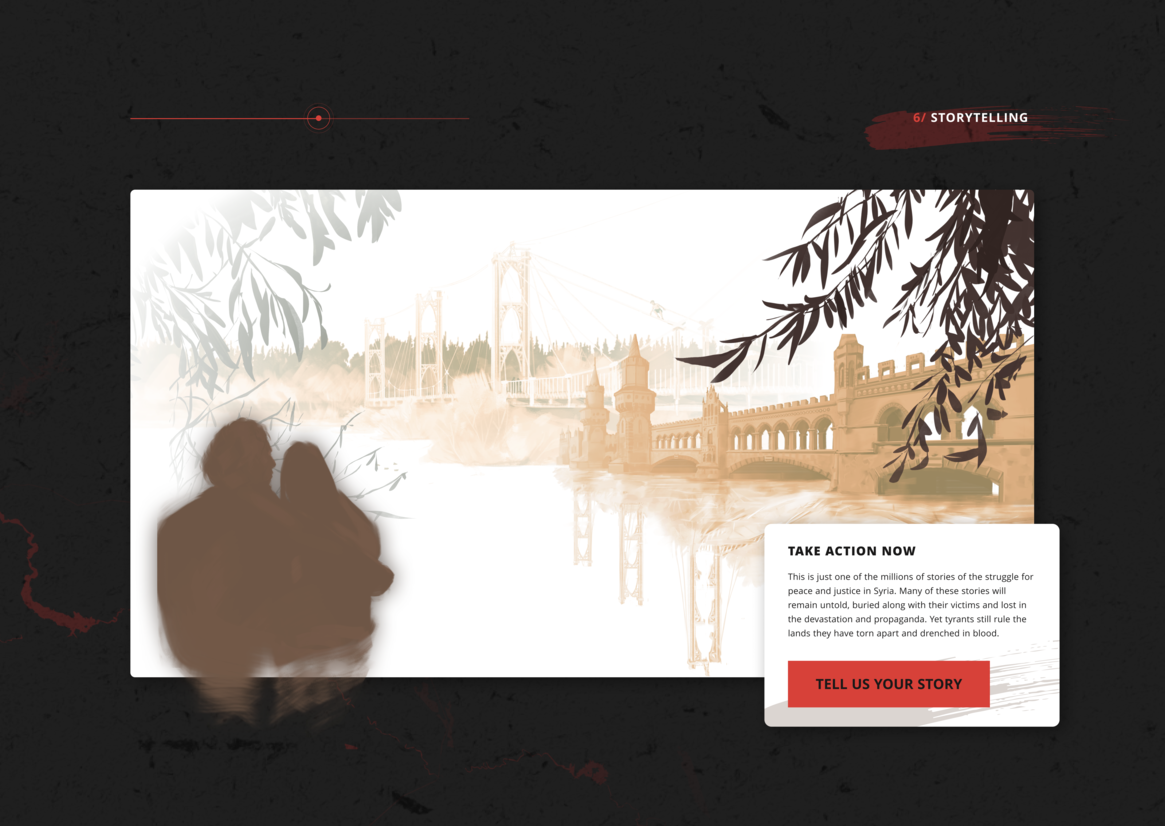 From the beginning, we knew the illustrations were the most important aspect of this project. To make each slide feel like a memory, we used a rough and expressional drawing style reminiscent of old paintings. This art style needed to be respectful of difficult emotions while staying palatable to a wide audience. A strategic use of colour and a consistent sepia tone push the idea that this is a memory set in the desert of Syria. Our artist drew every frame in Photoshop to make the animations feel more analog than digital. Using WebGL allowed us to make transitions smooth and cinematic, add texture around the site, and customise how each illustration moves.
