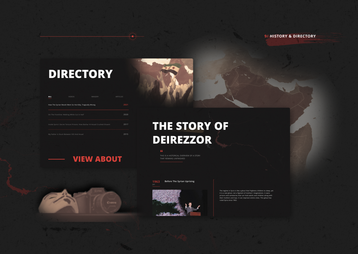 To provide context to the story, additional pages on the website teach users about the conflicts in Syria. A historical timeline tells the story of uprising and war in Deir Ezzor, while a gallery of Karam’s own photographs take us to the frontlines. Personal stories, political insights, and beautiful poetry all written by Karam can be found on the Articles page. A directory provides a collection of links that allow users to learn more about Syria.