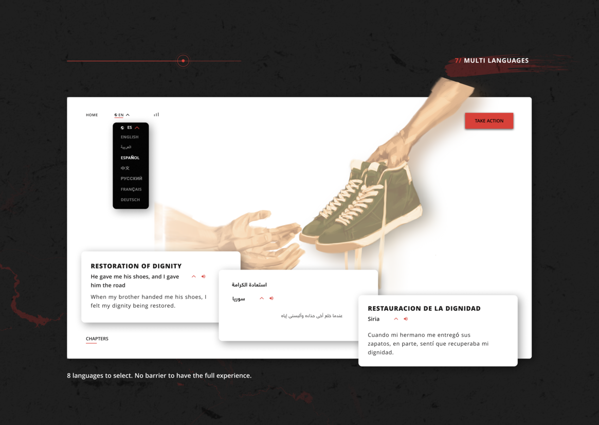 In order to make this story accessible to a global audience, both narration and text are available in 7 different languages. To make this possible, Karam worked with translators and voice actors from around the world through a CMS solution we created using Sanity.