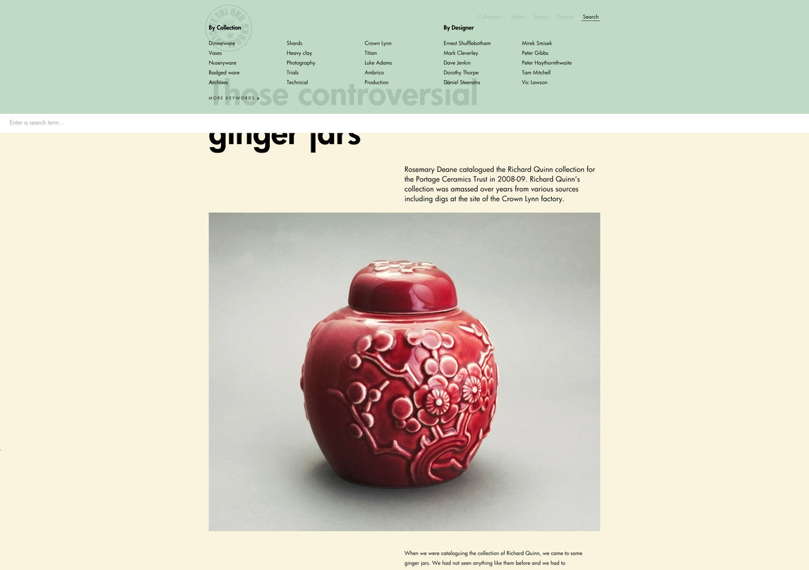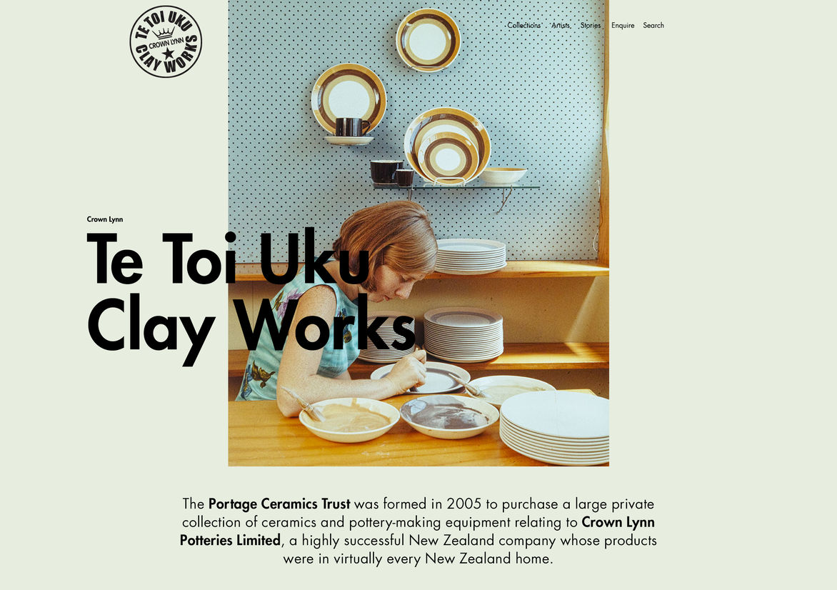 Digital Digital Campaigns Digital Products E-Commerce Websites (new 2024) Game Design Installation & Exhibition Large Scale Websites Small Scale Websites Student Digital User Experience (archived 2022) Animation Digital — formerly Interactive (2010–2019) Film Graphic Moving Image (archived 2025) Product Social Good Award Spatial Toitanga Value of Design Award User Experience Award (archived 2019) All categories Digital Campaigns Digital Products E-Commerce Websites (new 2024) Game Design Installation & Exhibition Large Scale Websites Small Scale Websites Student Digital User Experience (archived 2022) All years 2025 2024 2023 2022 2021 2020 2019 2018 2017 2016 2015 2014 2013 2012 2011 2010 Studio A-Z Reform 5 Portage Ceramics Trust 2015 Small Scale Websites Credits Pou Auaha / Creative Director Nadia Aftimos Kaitautoko / Contributor Emlyn Hughes Ngā Kaimahi / Team Members Stefan Clark, Nadia Aftimos Client Portage Ceramics Trust