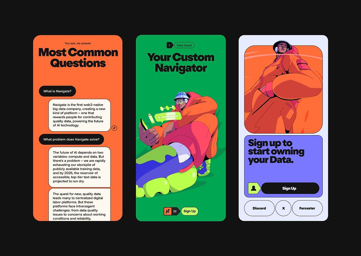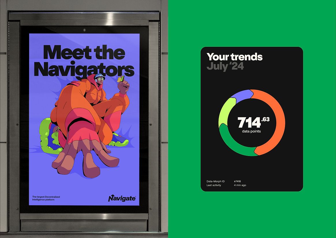 Navigate is gamifying and decentralising data collection, allowing users to take control of their data in the process. We created an engaging, playful website, combining unique branding moments and lively motion design to introduce users to a brand-new data ecosystem. The website successfully merges interactivity and storytelling to deliver an engaging user experience. Through dynamic animations and custom navigation elements, it simplifies complex concepts and makes onboarding users easy. Navigate moves forward with a bold visual identity and an intuitive platform that welcomes users into the future of decentralised data collection.