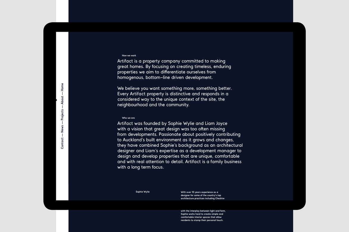 Digital Digital Campaigns Digital Products E-Commerce Websites (new 2024) Game Design Installation & Exhibition Large Scale Websites Small Scale Websites Student Digital User Experience (archived 2022) Animation Digital — formerly Interactive (2010–2019) Film Graphic Moving Image (archived 2025) Product Social Good Award Spatial Toitanga Value of Design Award User Experience Award (archived 2019) All categories Digital Campaigns Digital Products E-Commerce Websites (new 2024) Game Design Installation & Exhibition Large Scale Websites Small Scale Websites Student Digital User Experience (archived 2022) All years 2025 2024 2023 2022 2021 2020 2019 2018 2017 2016 2015 2014 2013 2012 2011 2010 Studio A-Z Seachange 83 Grafik 28 Artifact Property Finalist 2017 Small Scale Websites Credits Pou Auaha / Creative Directors Tim Donaldson, Amanda Gaskin Kaitautoko / Contributor Grafik Client Artifact Property