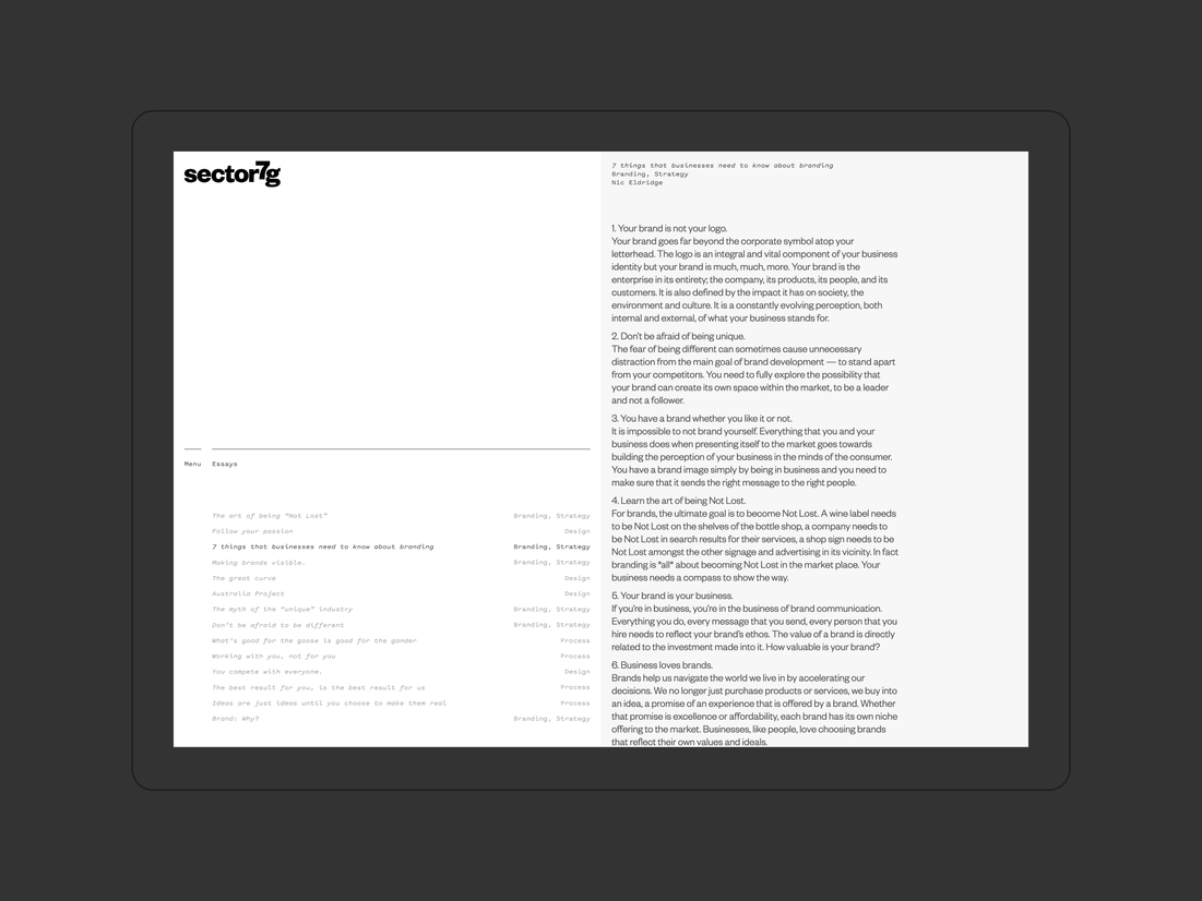 Digital Digital Campaigns Digital Products E-Commerce Websites (new 2024) Game Design Installation & Exhibition Large Scale Websites Small Scale Websites Student Digital User Experience (archived 2022) Animation Digital — formerly Interactive (2010–2019) Film Graphic Moving Image (archived 2025) Product Social Good Award Spatial Toitanga Value of Design Award User Experience Award (archived 2019) All categories Digital Campaigns Digital Products E-Commerce Websites (new 2024) Game Design Installation & Exhibition Large Scale Websites Small Scale Websites Student Digital User Experience (archived 2022) All years 2025 2024 2023 2022 2021 2020 2019 2018 2017 2016 2015 2014 2013 2012 2011 2010 Studio A-Z sector7g 3 sector7g website Finalist 2020 Small Scale Websites Credits Pou Auaha / Creative Director Nic Eldridge Ringatoi Matua / Design Director Nathan Adams Ngā Kaimahi / Team Member Hannah Eldridge