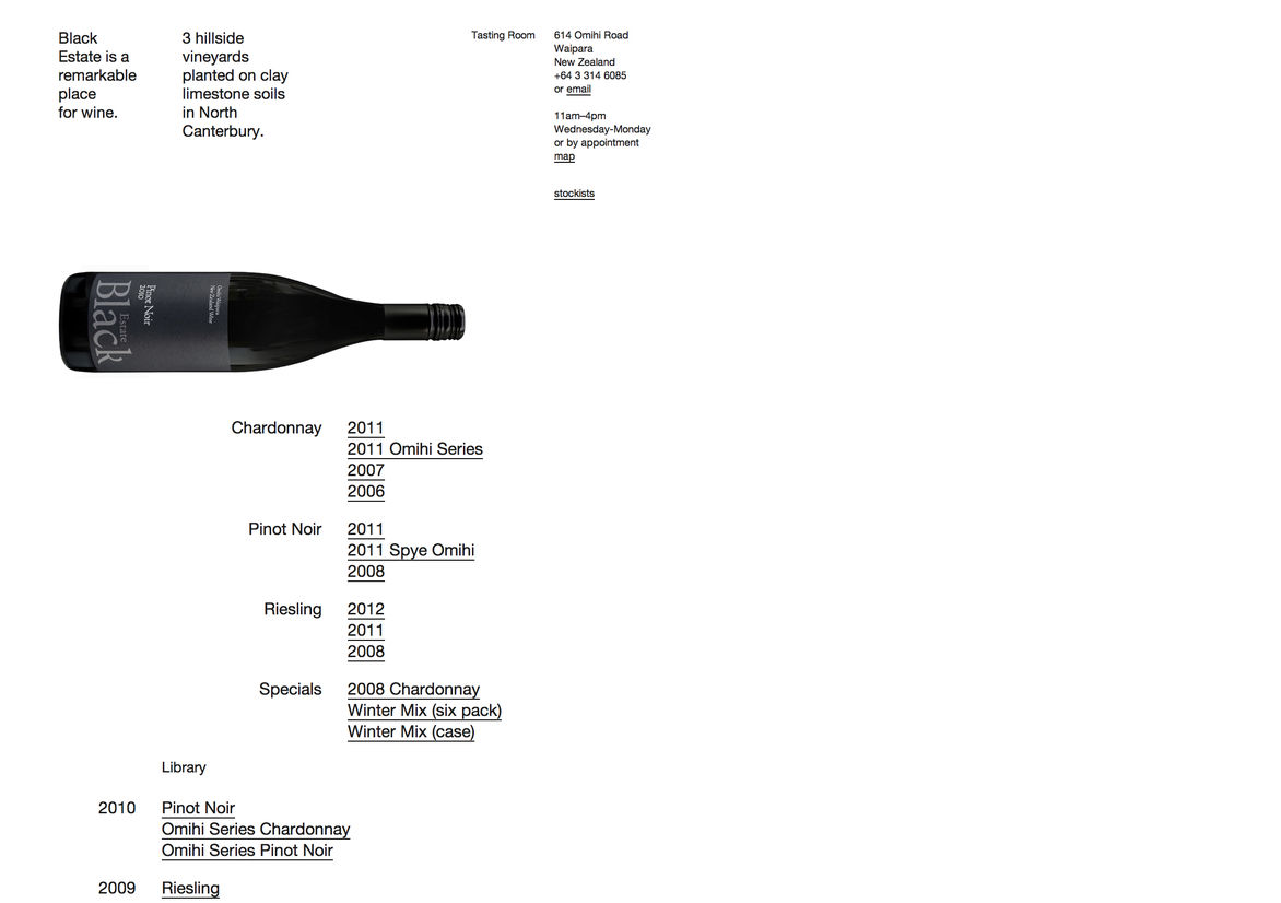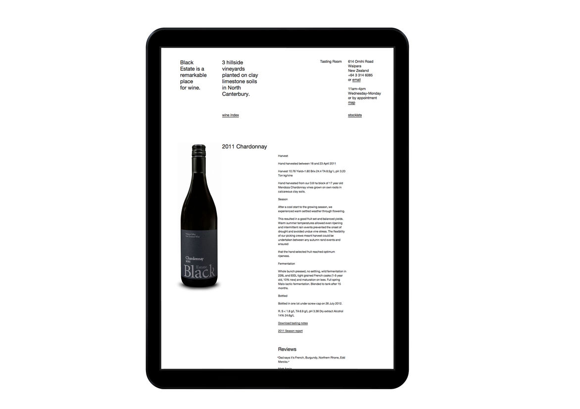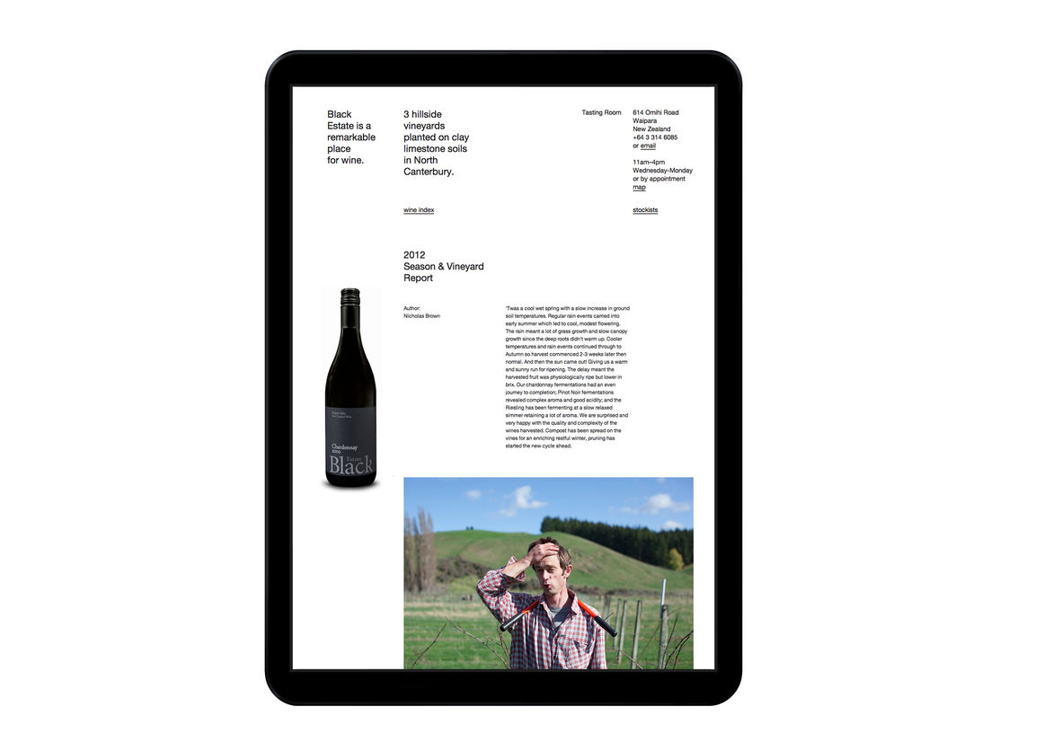 Digital Digital Campaigns Digital Products E-Commerce Websites (new 2024) Game Design Installation & Exhibition Large Scale Websites Small Scale Websites Student Digital User Experience (archived 2022) Animation Digital — formerly Interactive (2010–2019) Film Graphic Moving Image (archived 2025) Product Social Good Award Spatial Toitanga Value of Design Award User Experience Award (archived 2019) All categories Digital Campaigns Digital Products E-Commerce Websites (new 2024) Game Design Installation & Exhibition Large Scale Websites Small Scale Websites Student Digital User Experience (archived 2022) All years 2025 2024 2023 2022 2021 2020 2019 2018 2017 2016 2015 2014 2013 2012 2011 2010 Studio A-Z Sons & Co. 137 Black Estate 2014 Small Scale Websites Credits Pou Auaha / Creative Director Timothy Kelleher Ngā Kaimahi / Team Members Matthew Arnold, Matthew Wilson Kaitautoko / Contributor Jarred Bishop Client Black Estate