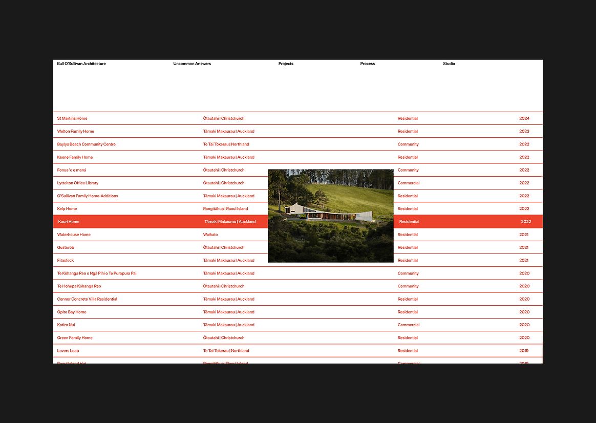 Digital Digital Campaigns Digital Products E-Commerce Websites (new 2024) Game Design Installation & Exhibition Large Scale Websites Small Scale Websites Student Digital User Experience (archived 2022) Animation Digital — formerly Interactive (2010–2019) Film Graphic Moving Image (archived 2025) Product Social Good Award Spatial Toitanga Value of Design Award User Experience Award (archived 2019) All categories Digital Campaigns Digital Products E-Commerce Websites (new 2024) Game Design Installation & Exhibition Large Scale Websites Small Scale Websites Student Digital User Experience (archived 2022) All years 2025 2024 2023 2022 2021 2020 2019 2018 2017 2016 2015 2014 2013 2012 2011 2010 Studio A-Z Sons & Co. 137 Bull O'Sullivan Architecture Finalist 2024 Small Scale Websites Credits Pou Auaha / Creative Director Timothy Kelleher Ngā Kaimahi / Team Members Matthew Arnold, Paul Bright Kaitautoko / Contributors John Walsh, Mary Gaudin