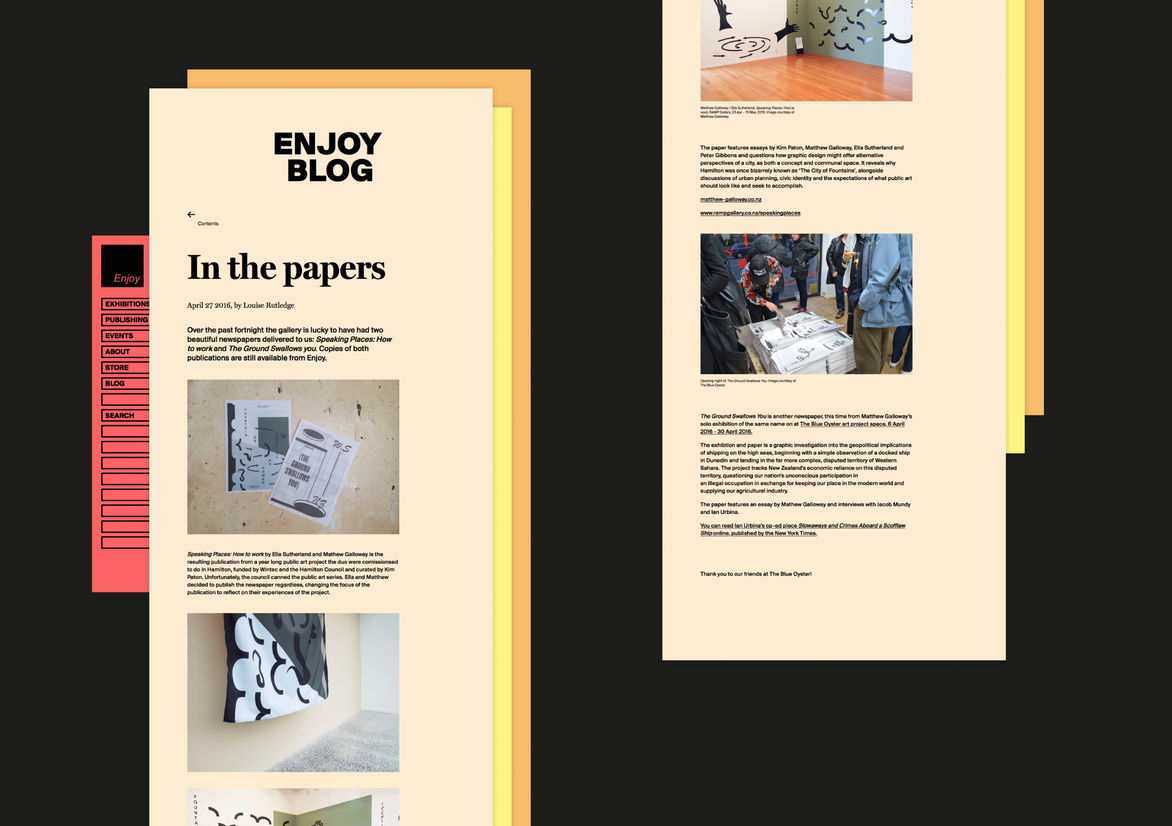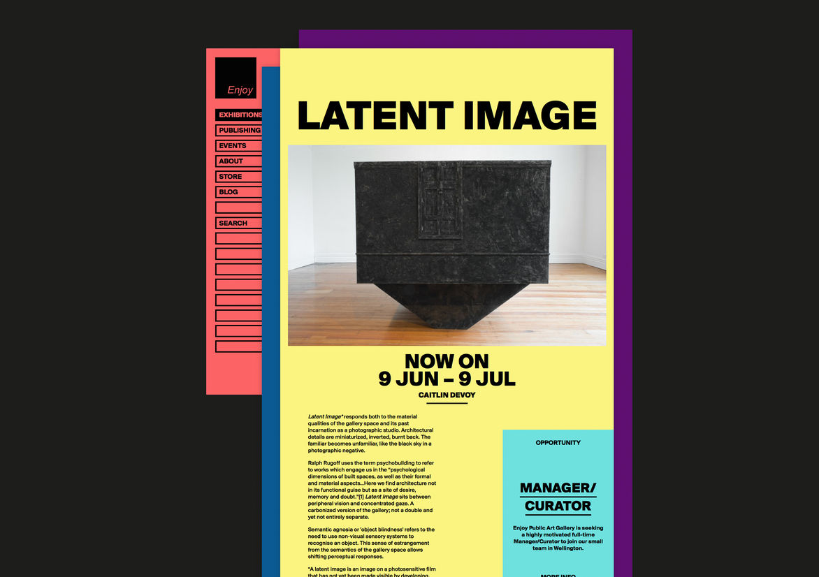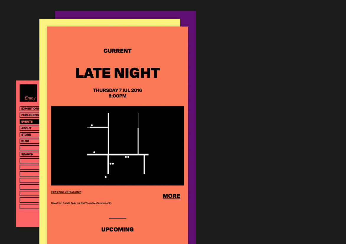 Digital Digital Campaigns Digital Products E-Commerce Websites (new 2024) Game Design Installation & Exhibition Large Scale Websites Small Scale Websites Student Digital User Experience (archived 2022) Animation Digital — formerly Interactive (2010–2019) Film Graphic Moving Image (archived 2025) Product Social Good Award Spatial Toitanga Value of Design Award User Experience Award (archived 2019) All categories Digital Campaigns Digital Products E-Commerce Websites (new 2024) Game Design Installation & Exhibition Large Scale Websites Small Scale Websites Student Digital User Experience (archived 2022) All years 2025 2024 2023 2022 2021 2020 2019 2018 2017 2016 2015 2014 2013 2012 2011 2010 Studio A-Z Sons & Co. 137 Enjoy Gallery 2016 Small Scale Websites Credits Pou Auaha / Creative Director Timothy Kelleher Ngā Kaimahi / Team Members Greg Brown, Matthew Arnold Client Enjoy Public Gallery