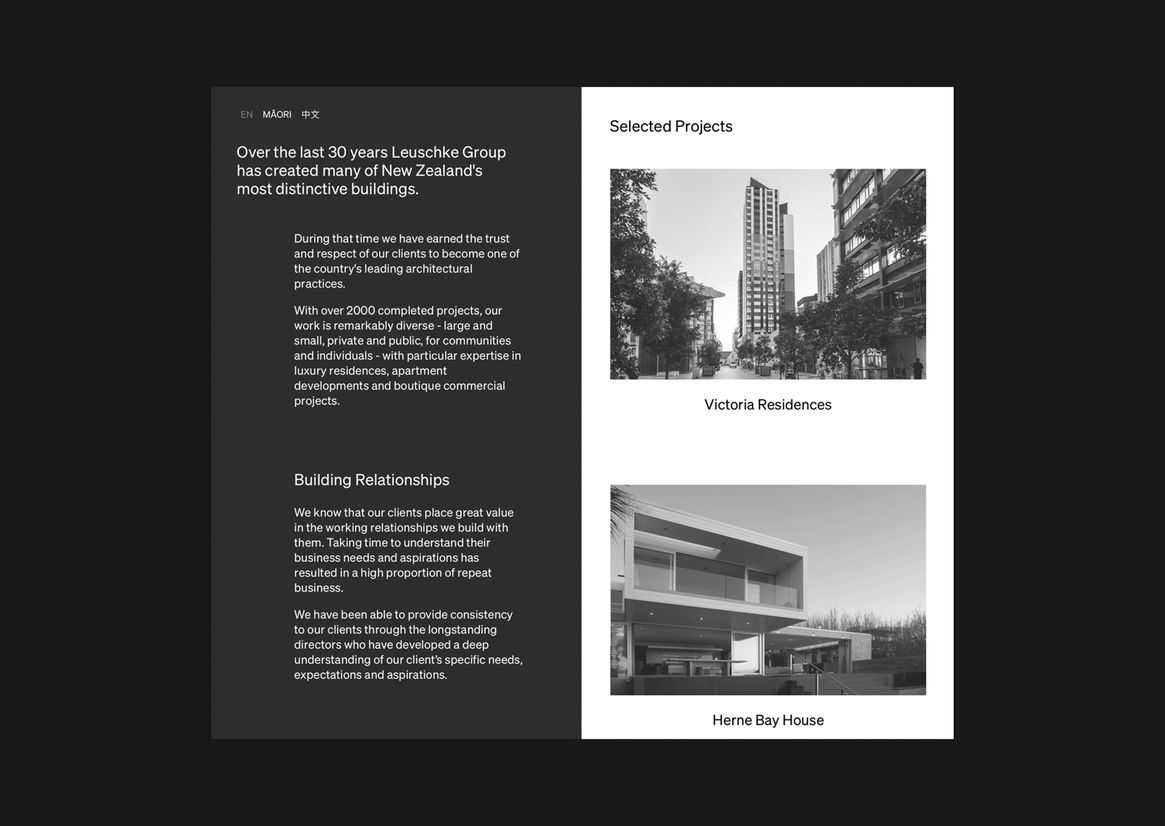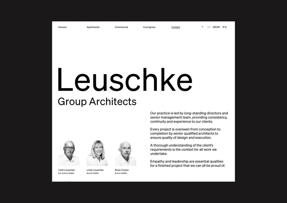 Digital Digital Campaigns Digital Products E-Commerce Websites (new 2024) Game Design Installation & Exhibition Large Scale Websites Small Scale Websites Student Digital User Experience (archived 2022) Animation Digital — formerly Interactive (2010–2019) Film Graphic Moving Image (archived 2025) Product Social Good Award Spatial Toitanga Value of Design Award User Experience Award (archived 2019) All categories Digital Campaigns Digital Products E-Commerce Websites (new 2024) Game Design Installation & Exhibition Large Scale Websites Small Scale Websites Student Digital User Experience (archived 2022) All years 2025 2024 2023 2022 2021 2020 2019 2018 2017 2016 2015 2014 2013 2012 2011 2010 Studio A-Z Sons & Co. 137 Leuschke Group Finalist 2018 Small Scale Websites Credits Pou Auaha / Creative Director Timothy Kelleher Ngā Kaimahi / Team Members Matthew Arnold, Greg Brown Kaitautoko / Contributor Luke Leuschke Client Leuschke Group