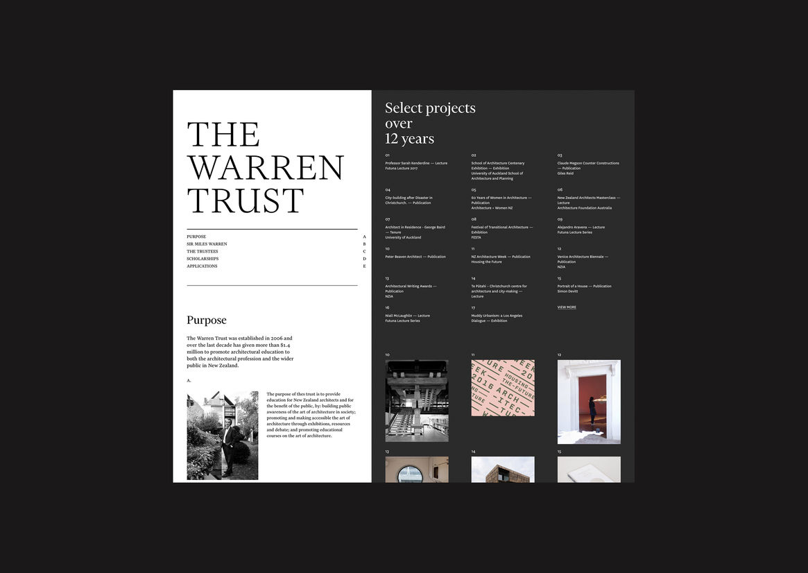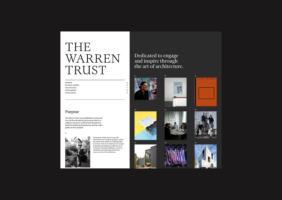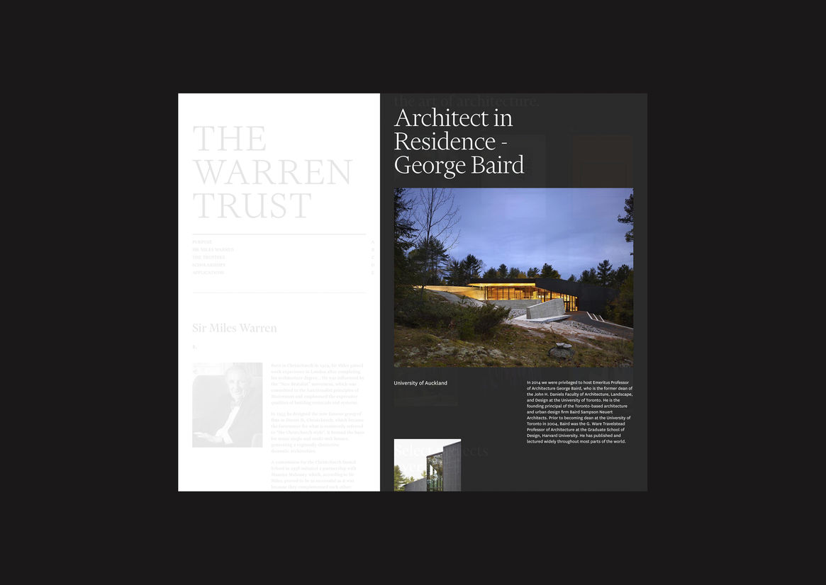 Digital Digital Campaigns Digital Products E-Commerce Websites (new 2024) Game Design Installation & Exhibition Large Scale Websites Small Scale Websites Student Digital User Experience (archived 2022) Animation Digital — formerly Interactive (2010–2019) Film Graphic Moving Image (archived 2025) Product Social Good Award Spatial Toitanga Value of Design Award User Experience Award (archived 2019) All categories Digital Campaigns Digital Products E-Commerce Websites (new 2024) Game Design Installation & Exhibition Large Scale Websites Small Scale Websites Student Digital User Experience (archived 2022) All years 2025 2024 2023 2022 2021 2020 2019 2018 2017 2016 2015 2014 2013 2012 2011 2010 Studio A-Z Sons & Co. 137 Warren Trust 2018 Small Scale Websites Credits Pou Auaha / Creative Director Timothy Kelleher Ngā Kaimahi / Team Members Matthew Arnold, Greg Brown Client Warren Trust