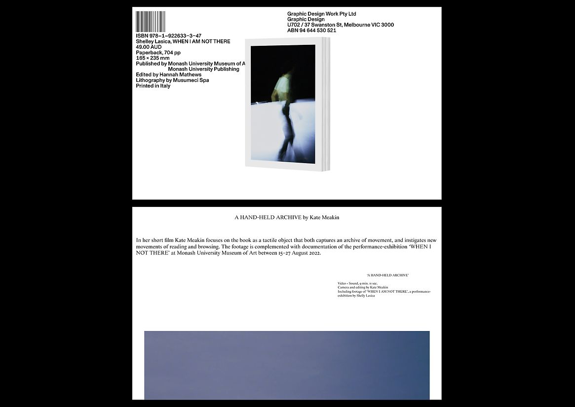 This is the first in a series of on-line publications dedicated to exploring our core studio practice—publication design. This one details the publication designed with and for the Australian choreographer and dancer Shelley Lasica. Lasica’s work reveals a sustained exploration of dance, movement and the varying contexts in which they can occur. The publication ‘WHEN I AM NOT THERE’ has been produced to accompany a performance-exhibition at Monash University Museum of Art (MUMA) reflecting on forty years of Lasica’s choreographic practice.