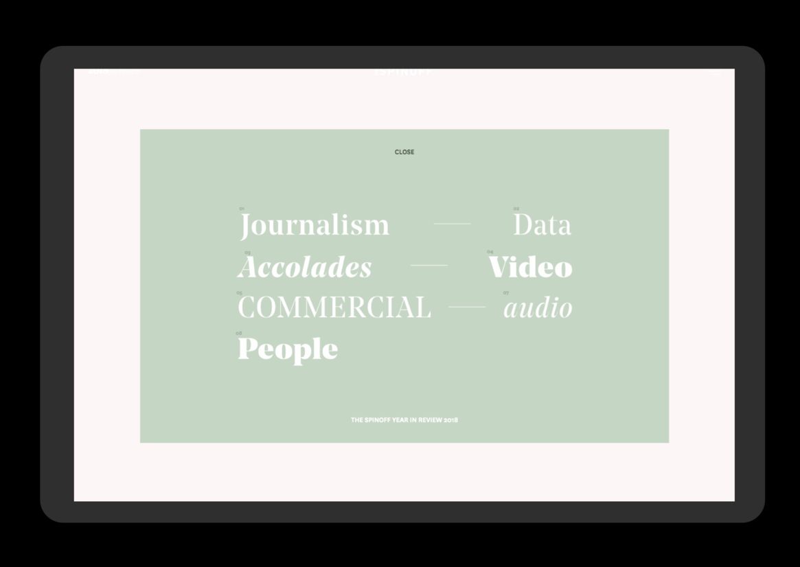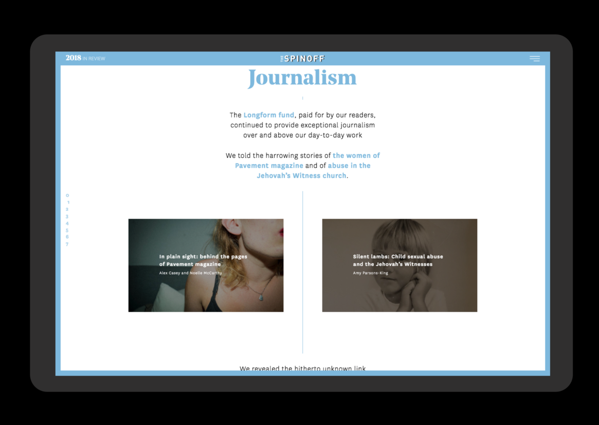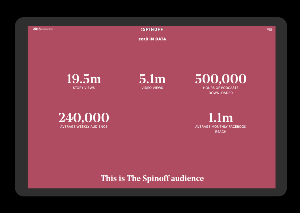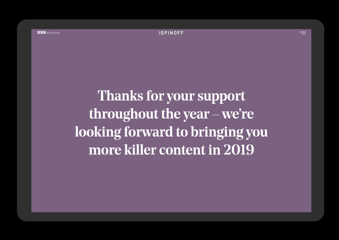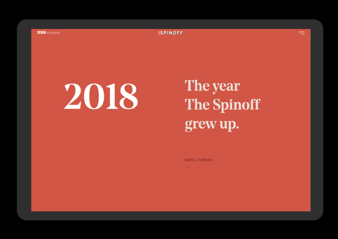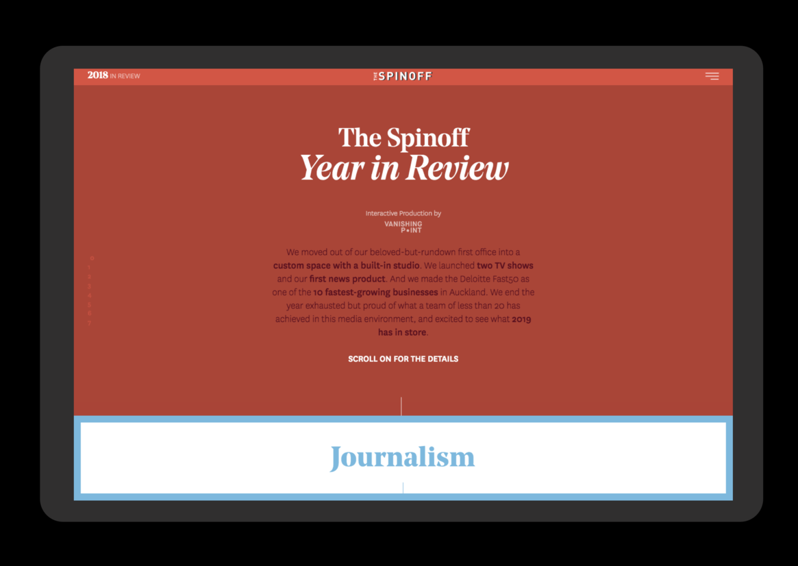 Digital Digital Campaigns Digital Products E-Commerce Websites (new 2024) Game Design Installation & Exhibition Large Scale Websites Small Scale Websites Student Digital User Experience (archived 2022) Animation Digital — formerly Interactive (2010–2019) Film Graphic Moving Image (archived 2025) Product Social Good Award Spatial Toitanga Value of Design Award User Experience Award (archived 2019) All categories Digital Campaigns Digital Products E-Commerce Websites (new 2024) Game Design Installation & Exhibition Large Scale Websites Small Scale Websites Student Digital User Experience (archived 2022) All years 2025 2024 2023 2022 2021 2020 2019 2018 2017 2016 2015 2014 2013 2012 2011 2010 Studio A-Z Vanishing Point 5 The Spinoff Year in Review Finalist 2019 Small Scale Websites Credits Pou Auaha / Creative Director Charles Anderson Ringatoi Matua / Design Director Allan Walker Client The Spinoff