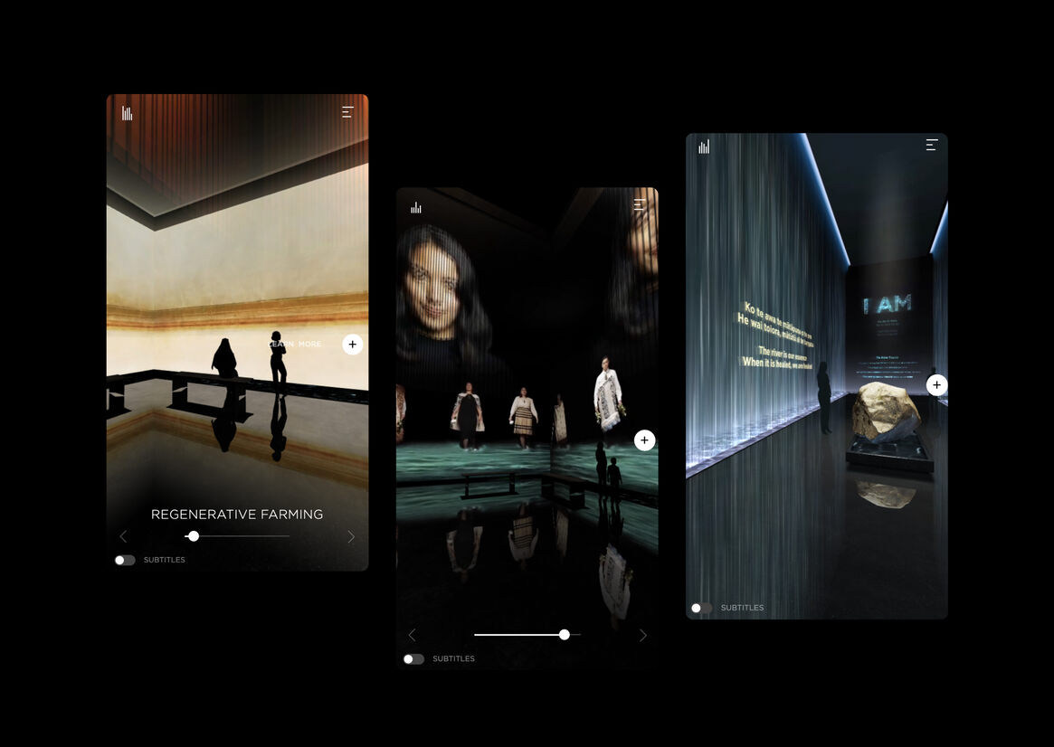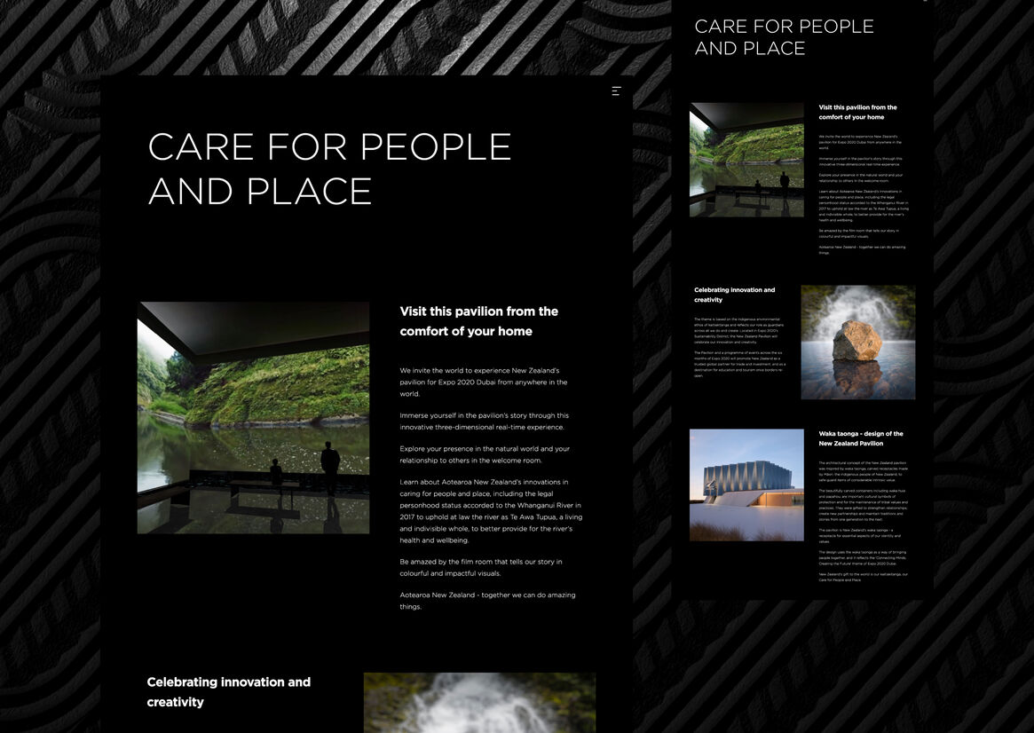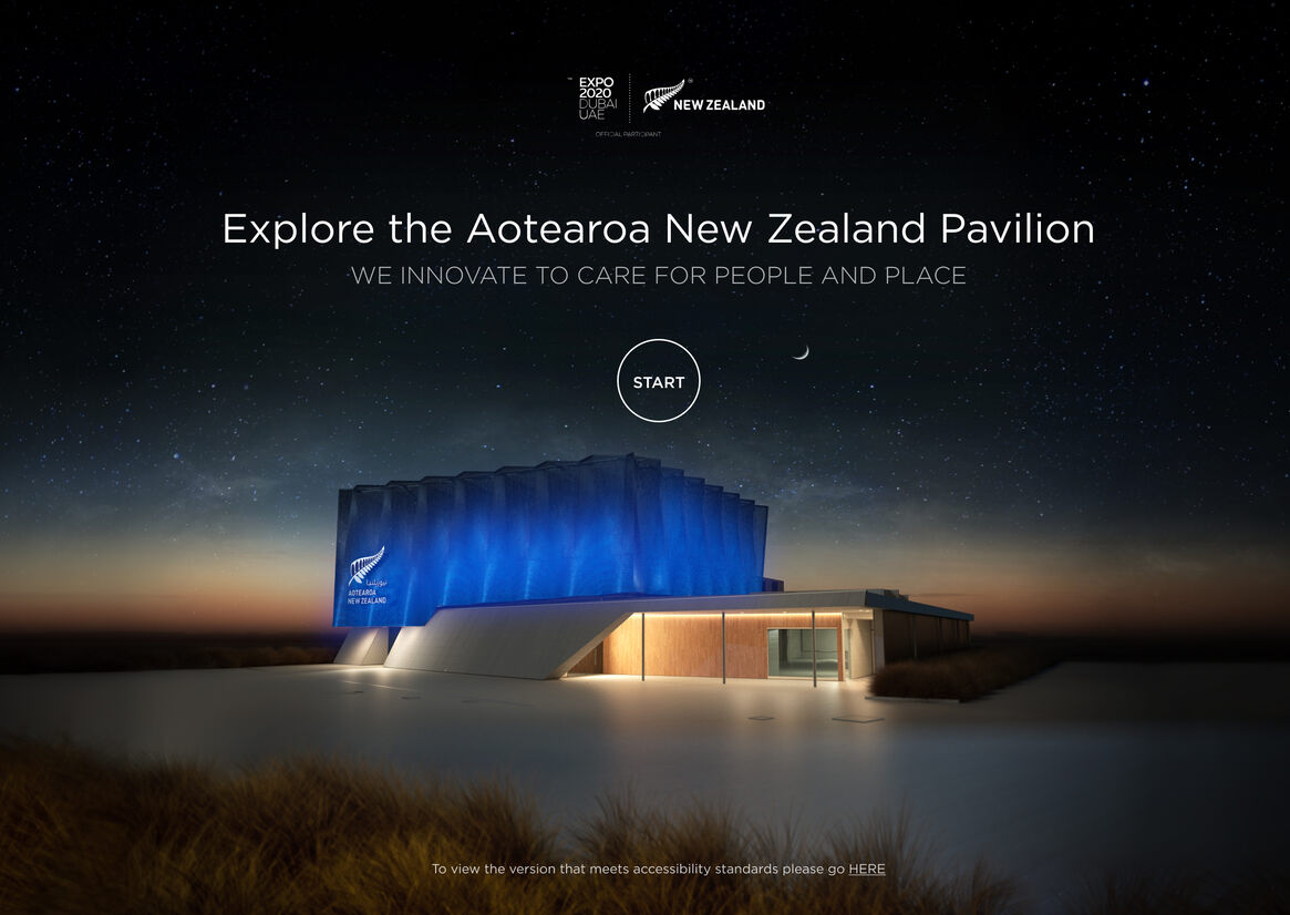 New Zealand virtual pavilion tour - designed to take visitors on a digital journey through the pavilion at the EXPO 2020. A showcase of creativity and innovation, the physical Aotearoa New Zealand pavilion experience combines sound, vision and other sensory inputs to bring to life its “Care for People and Place” theme. The virtual pavilion translates the physical experience into a cutting edge, immersive online experience for audiences around the globe to enjoy no matter their device.