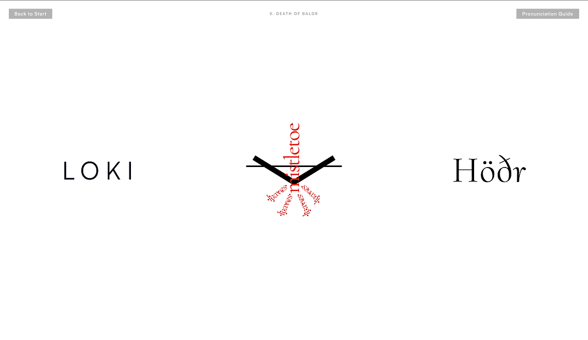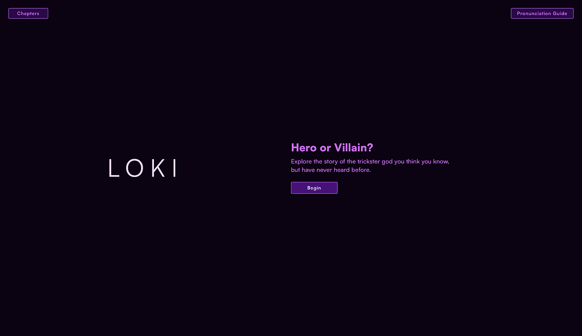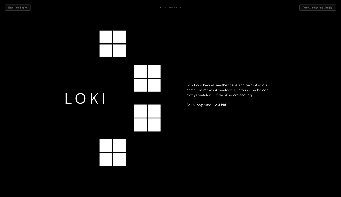 ‘Loki’ is an interactive storytelling experience that puts young adult readers (18-35 year olds) into an ancient tale from The Prose Edda, a collection of Nordic tales written by Snorri Sturluson in the 13th century. With a clean typographic approach, the experience focusses on telling an authentic Nordic tale while utilising modern technology to provide rich interactive elements. Designed to engage the reader, these interactive features breathe life into the story.