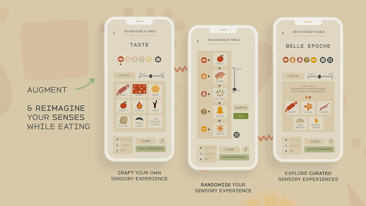 The design blends familiar tactile interfaces like remotes, gamepads, and analogue mixers with a warm, retro-futuristic user interface. Vibrant colours, organic shapes, and playful interactions intentionally contrast with the cold, sterile, optimised aesthetic common in dystopian design. Drawing inspiration from food design, memories and nostalgic cues– what we hear, taste, smell and feel when we eat, Palate encourages users to slow down and enjoy meals with others. Its gamified, sensory-driven experience invites active participation, prompting reflection on contemporary eating habits and the broader implications of prioritising efficiency over connection.