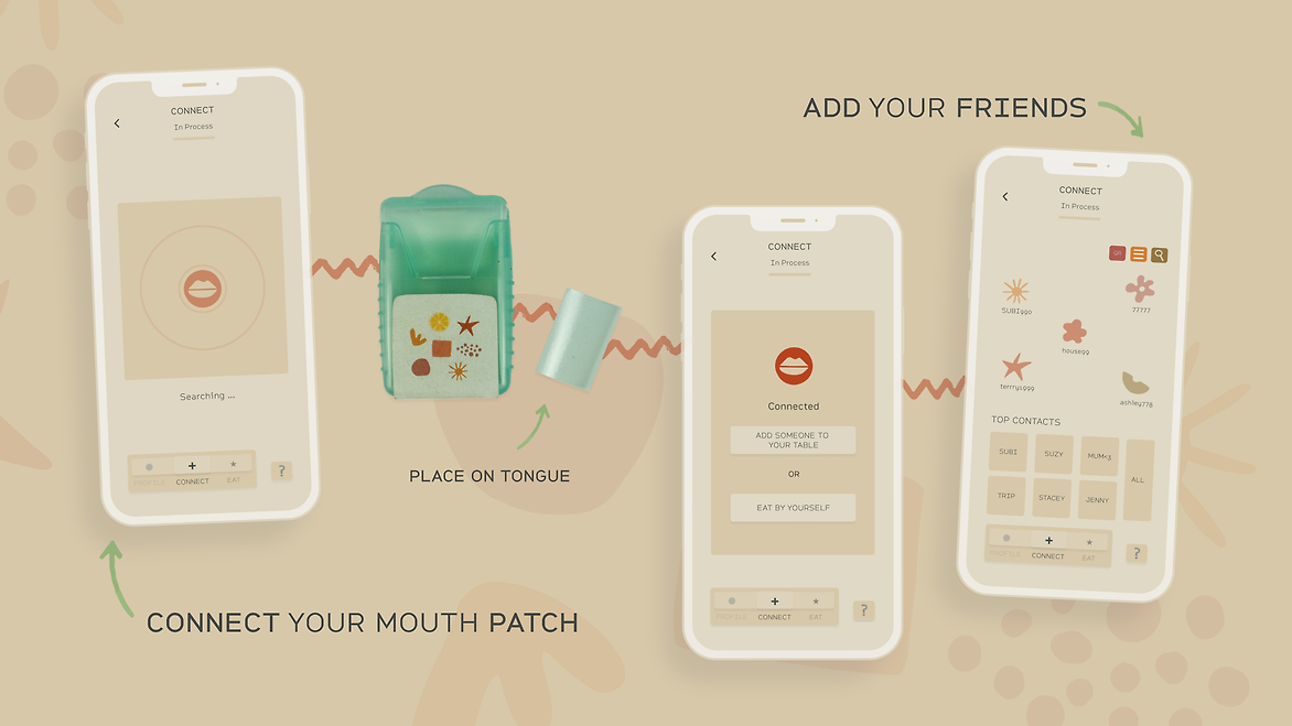 Palate presents a speculative interface connected to wearable ‘mouth patch,’ that augments users’ sensory perception of the food, altering taste, texture, smell, appearance and sound, without physically changing the food itself. Users can share these augmented sensory experiences remotely, enabling commensality across distance and dietary barriers. By focusing on playful and multi-sensory design, Palate seeks to restore the joy of eating together while addressing the constraints of dietary restrictions and physical separation. It raises questions about intimacy and shared experience; could experiencing food through intertwined senses deepen our social bonds? How might we design technology to enhance connection instead of isolation?