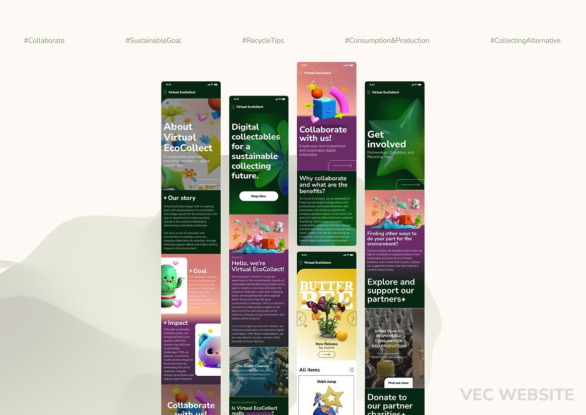 Motivated by the need for environmentally friendly practices, VEC seeks to mitigate the environmental footprint such as the production and consumption of collectible merchandise. By leveraging digital technology and innovative approaches, I have developed a platform that not only facilitates collecting but also promotes environmental consciousness among collectors. My approach involves creating a sustainable awareness marketing campaign, with their own engaging and user-friendly website and accompanying app for collecting digital items. Through these platforms, collectors are not only able to discover, buy, trade and share their collections but also engage with the campaign’s educational content on sustainability and environmental conservation. One notable feature of VEC is its integration of Augmented Reality Technology (AR). It provides collectors with an immersive and interactive collecting experience while minimizing the use of physical resources. Unlike traditional Non-Fungible Tokens (NFTs) that rely on blockchain technology and is known to contribute to negative environmental impacts, VEC prioritises environmental sustainability. While Virtual EcoCollect’s (VEC) contributions may be modest, I think it would impact the environmental benefits by reducing the demand for physical collectibles, thus lowering material waste and carbon emissions. Not only would it reach a broader audience through greater accessibility and scalability, but the platform would also foster a culture of sustainability by educating users on sustainable practices, promoting responsible consumption, and demonstrating the potential of innovative technologies like AR in mitigating environmental impacts. For future improvements, I envision further extending the loyalty to the campaign’s values. This involves taking care of the carbon emissions produced by the Virtual EcoCollect website and app. This can be done through carbon-neutral platform, powered by a green energy provider. While it may not eliminate