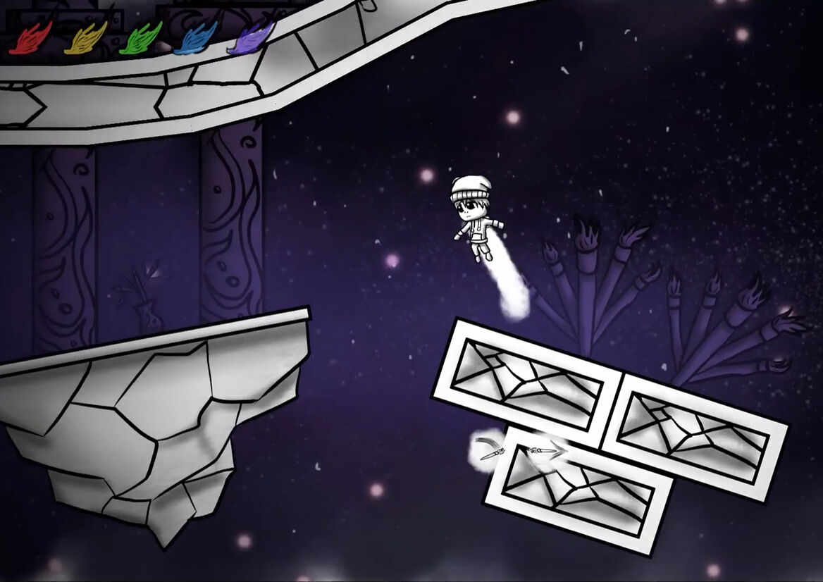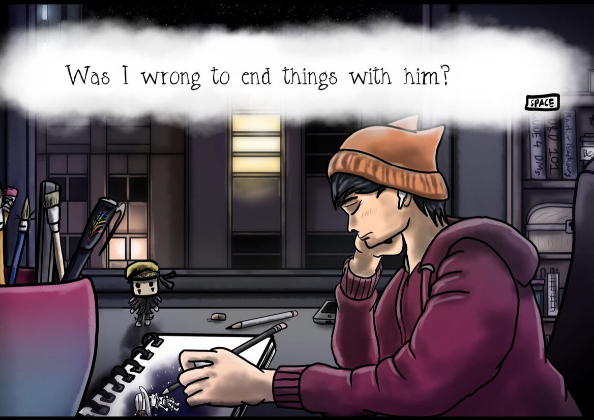 ‘What Draws Me’ In is a 2D platformer narrative game with a focus on the struggle of self-identity, in particular queer identity, about an artist who wakes up to find himself trapped within his own sketchbook. Befriending one of the characters he had drawn, the two journey together to find a way to escape as they confront and question their place in the world. This game was created from the desire to add a little more colour into the biggest canvas that is our imagination. As a tabletop-roleplaying enthusiast with a keen interest in creating and playing characters, I wanted to create a little story about the way we use works of art - animations, films, games, and so on - to express who we are without the prejudice of the real world. As someone under the LGBTQI umbrella, I also wanted to create and share a story inspired by my own experiences in the bumpy journey of learning to be comfortable with who I am, in the hopes of giving a simple message to those that need to hear it - be proud of who you are. Only you get to decide who you are, no one else. What Draws Me In is a project with a focus on its narrative. That being said, because this is a solo project, it meant I was simultaneously the game designer, writer, artist, animator and programmer. Furthermore, with my background in digital art, I envisioned the visual aesthetic to be like a painting in your own sketchbook that has come to life, where the barrier between the Creator and the Created can be broken.