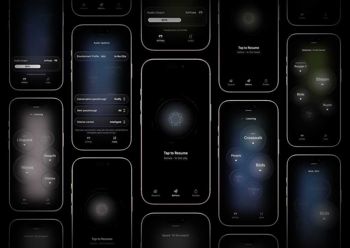 With just a mobile device and a pair of headphones, ReForm uses advanced machine learning to listen to your environment and separate individual sounds in real time. These sounds appear as soft bubbles you can tap, hold, and drag to mute or amplify. Over time, ReForm learns from your actions, building environment profiles that adjust automatically as you move from one place to another. The more you use it, the less you have to think about it.
