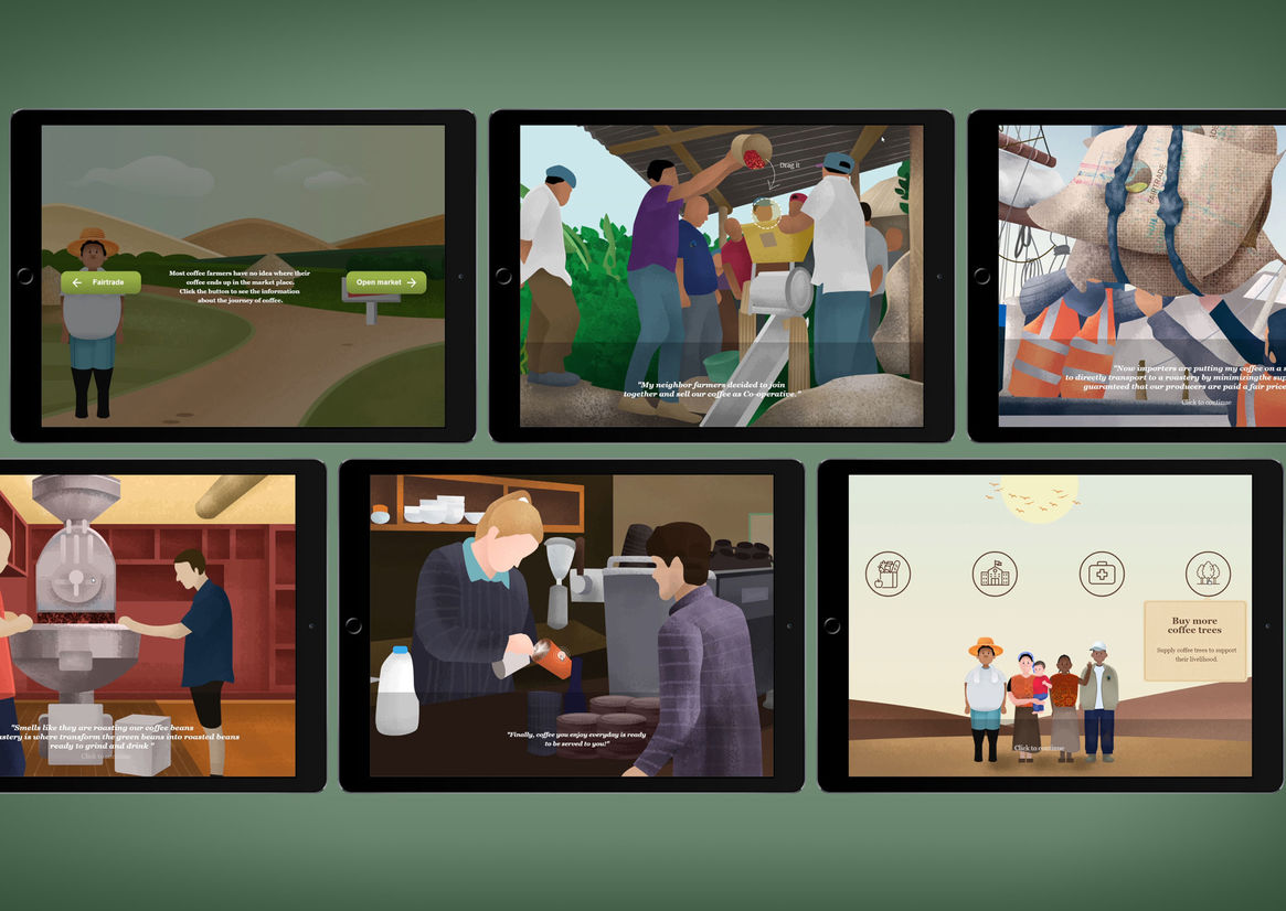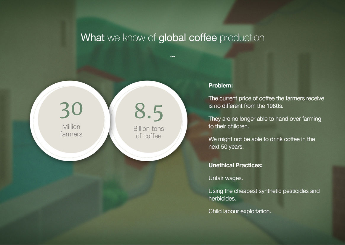 ‘The Whole Journey Behind Your Coffee’ (‘TWJBYC’) is an illustrated interactive experience that tells the journey that coffee makes from the plantation to the consumer. The project is aimed at millennials and is meant to inform and educate about sustainable and ethical practices in one the world’s largest commodities. As a creative concept, ‘TWJBYC’ is intended to bring attention to the chain of production, distribution and retailing coffee – and how we choose and consume coffee has a reverse-ripple effect back to the coffee farmers. The illustrations itself are colourful, wholesome and visually engaging. This experience hopes to bring an awareness to the practices of the coffee trade, in order to help us, as consumers, make better buying decisions.