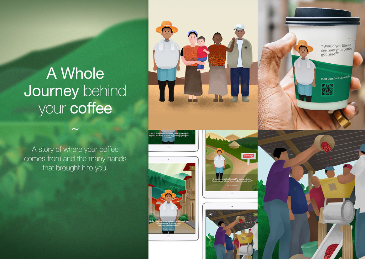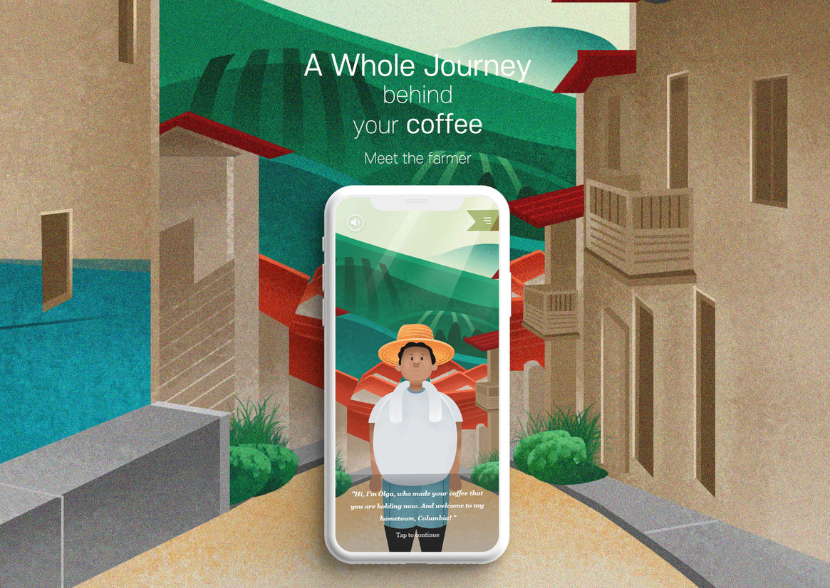A design thinking methodology was engaged for the research and design process. Much of the design decisions came from user testing and feedback. Considerations were applied to the illustration style to encapsulate the project’s messaging for sustainability, eco-awareness and ethical practice. The story flow provides customers with information of where these coffee beans originate from, and the people who grew them, by using blockchain technology to track the supply chain. In order to connect the target audience and the medium, a QR code and the website link is placed on the takeaway cup.