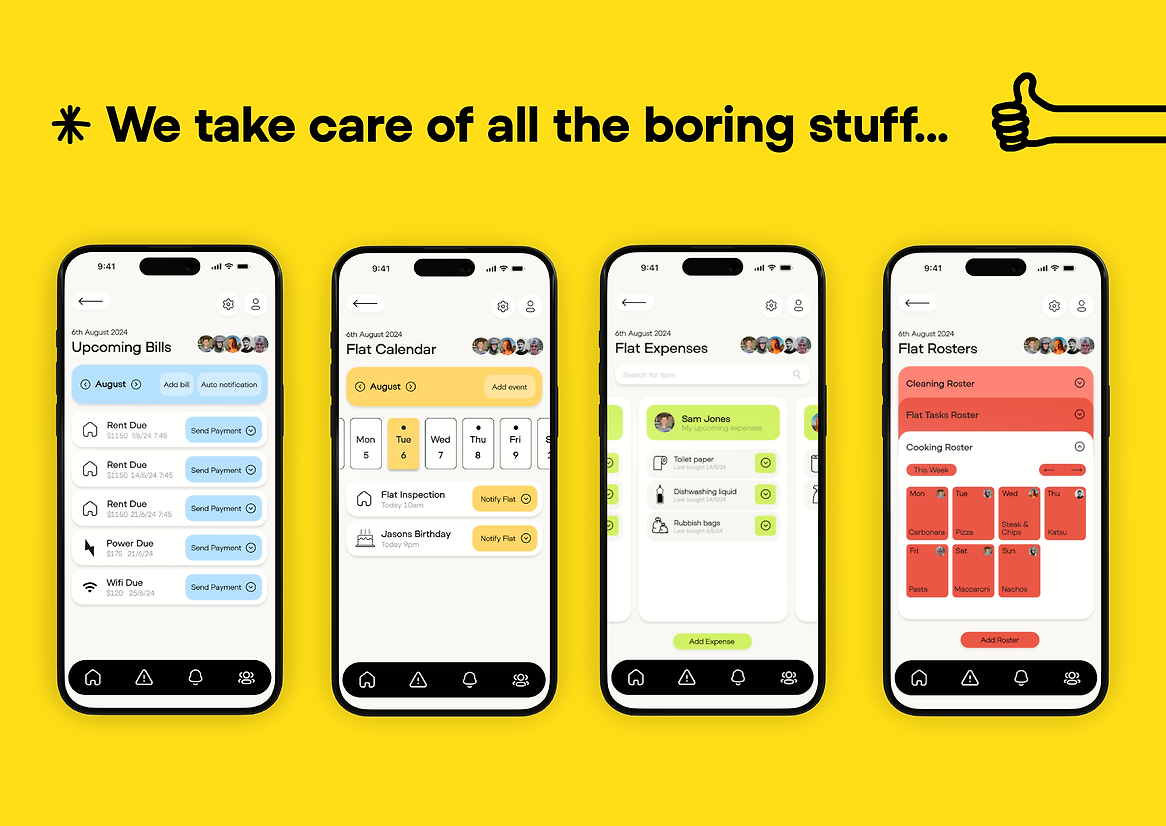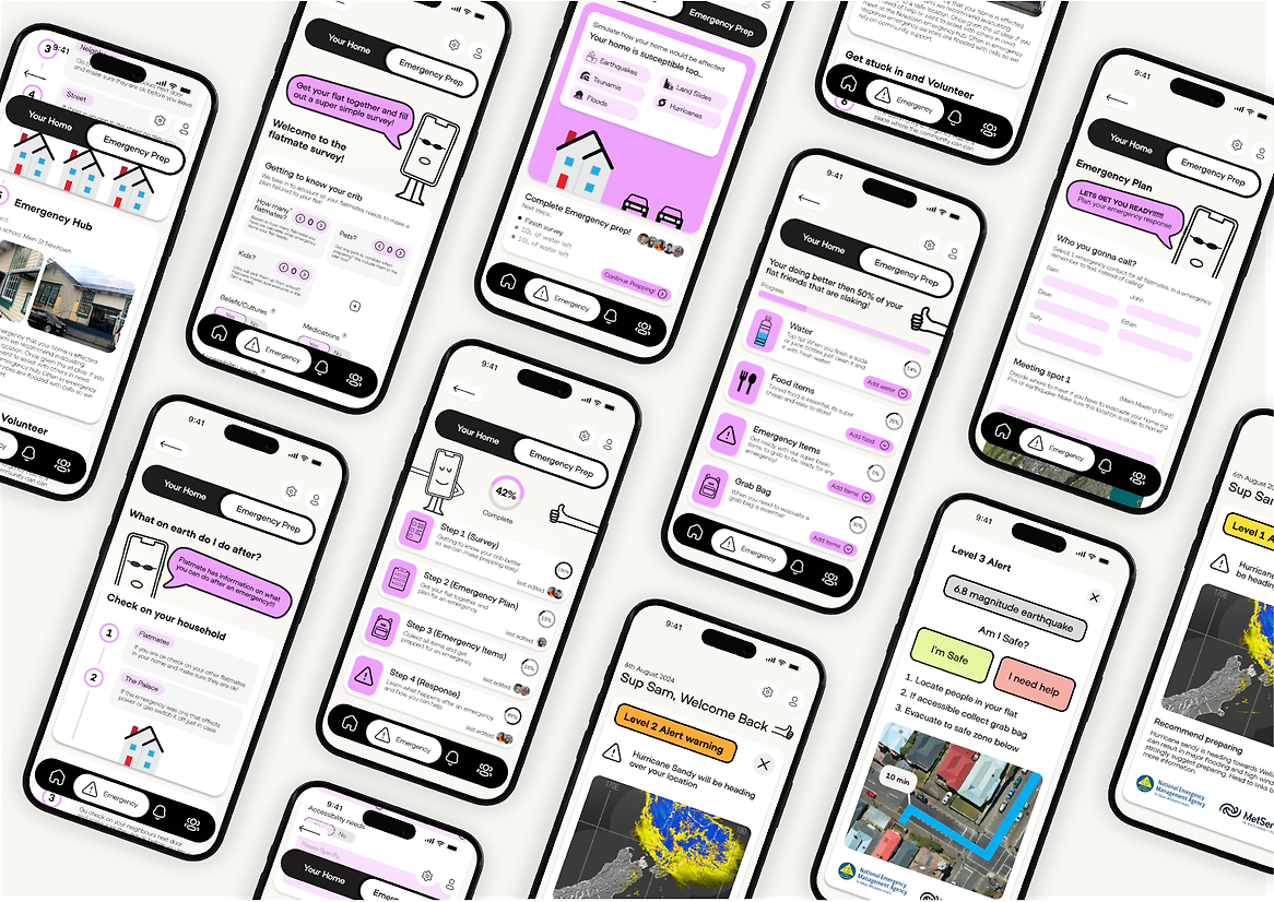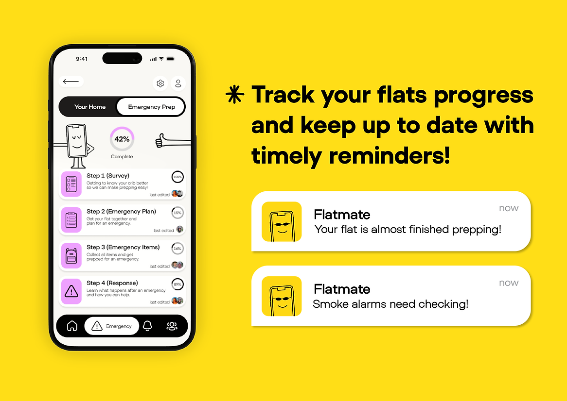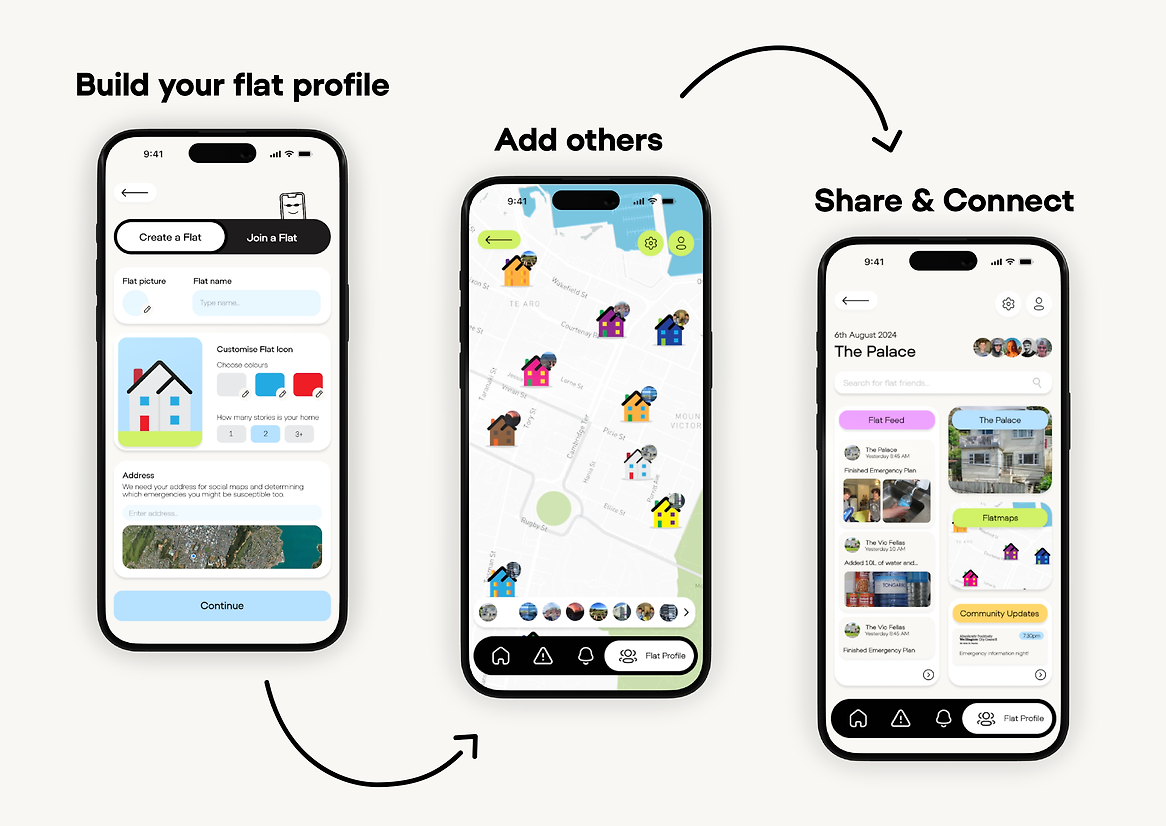 Flatmate is a mobile app that embeds emergency preparedness into the everyday routines of student flatting life through a relatable, supportive platform. Flatmate leverages the "Trojan Horse" concept. Students are drawn to its flat management features like splitting bills and tracking chores, and emergency preparedness is introduced naturally alongside these tools. Using behavioural insights and a fun, student-friendly tone, the app includes a four-step plan tailored to each flat. Campaigns like #dontbethatflatmate use humour and relatability to drive downloads during key moments like O-Week. Emergency preparation becomes something students do without even realising it, normalised, embedded, and shared socially. This approach meets students where they are, weaving critical preparedness into real moments of change when they’re setting up their first flat and open to new tools and routines.