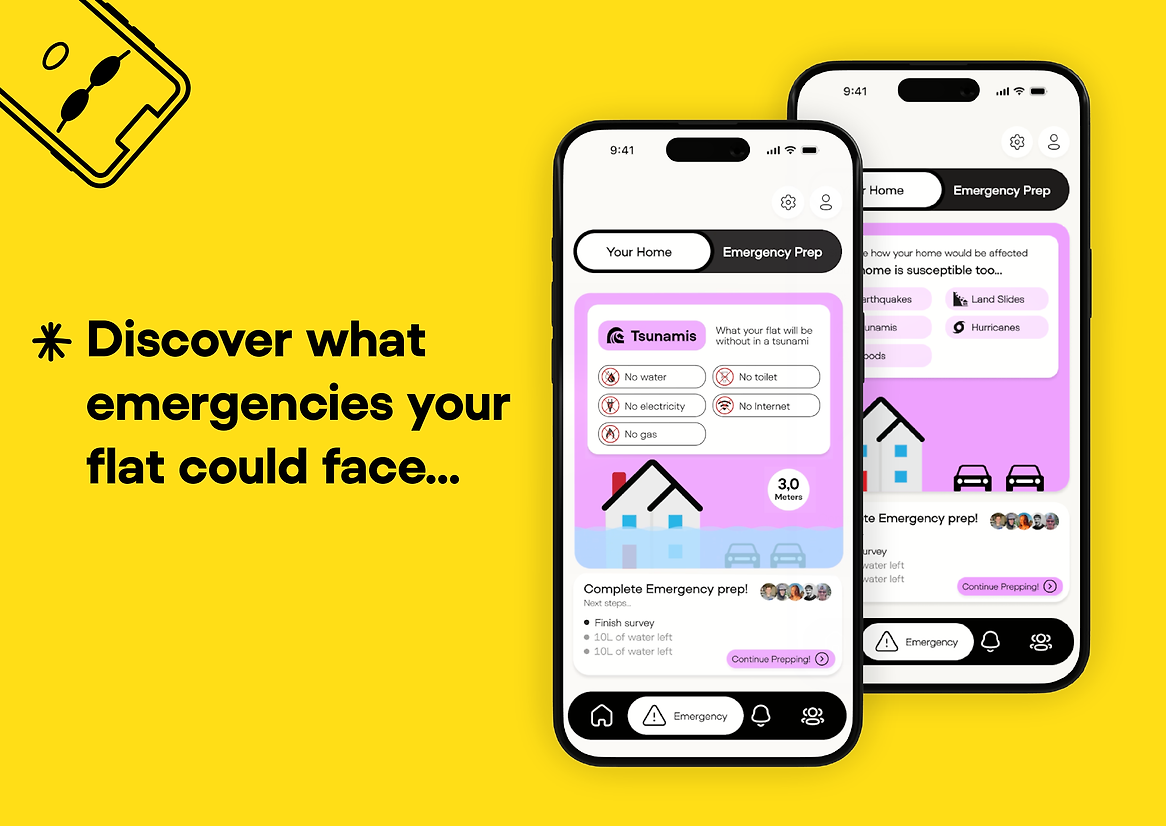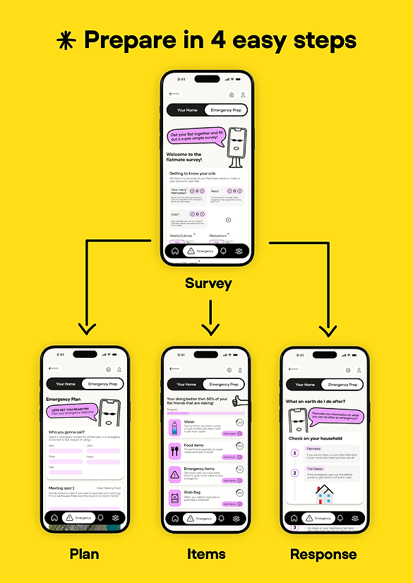 Flatmate’s tone is casual and conversational, breaking away from the typical formal emergency language. Visuals are clean and playful, with a colour-coded dashboard and a character-driven brand identity that feels more like a mate than a manual. The app begins with a humanised risk perception animation. Using AI intelligence Flatmate shows students how a disaster could affect their flats exact location to spark action. Our 4 step plan starts with a personalised survey that tailors preparation steps to each flat’s needs like pets, accessibility, medications, etc. Flatmate also features real-time alerts escalating from early warnings to Level 3, activating peer-to-peer support between nearby flats using the in-app community feature. Flatmate feels like adding a helpful, organised flatmate who keeps you on track without pressure.