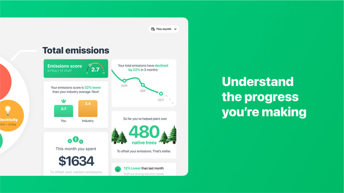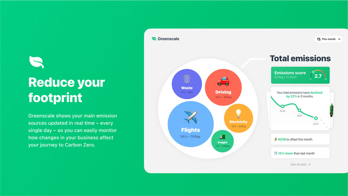 Greenscale is an app that changes that by showing business owners their emissions in real-time – as soon as they create them. The app helps businesses measure their emissions, provides advice on how to reduce emissions, and helps them share their progress with customers.