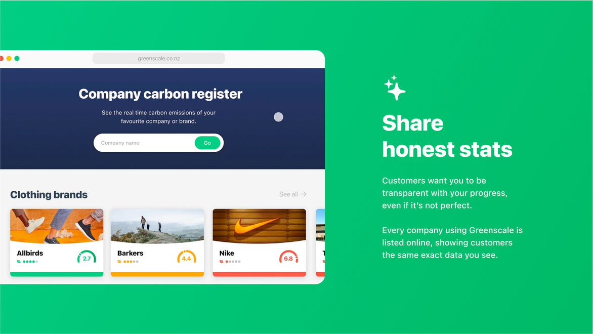 Customers, employees and investors increasingly want to understand your company's emissions, and compare you to competitors. Greenscale allows you to easily share your progress in the most transparent way – letting people see all your emissions data. Every company using Greenscale is visible on the 'Company Carbon Register' website for everyone to see. There's no green-washed marketing speak here – just facts and figures – presented in an honest fashion.