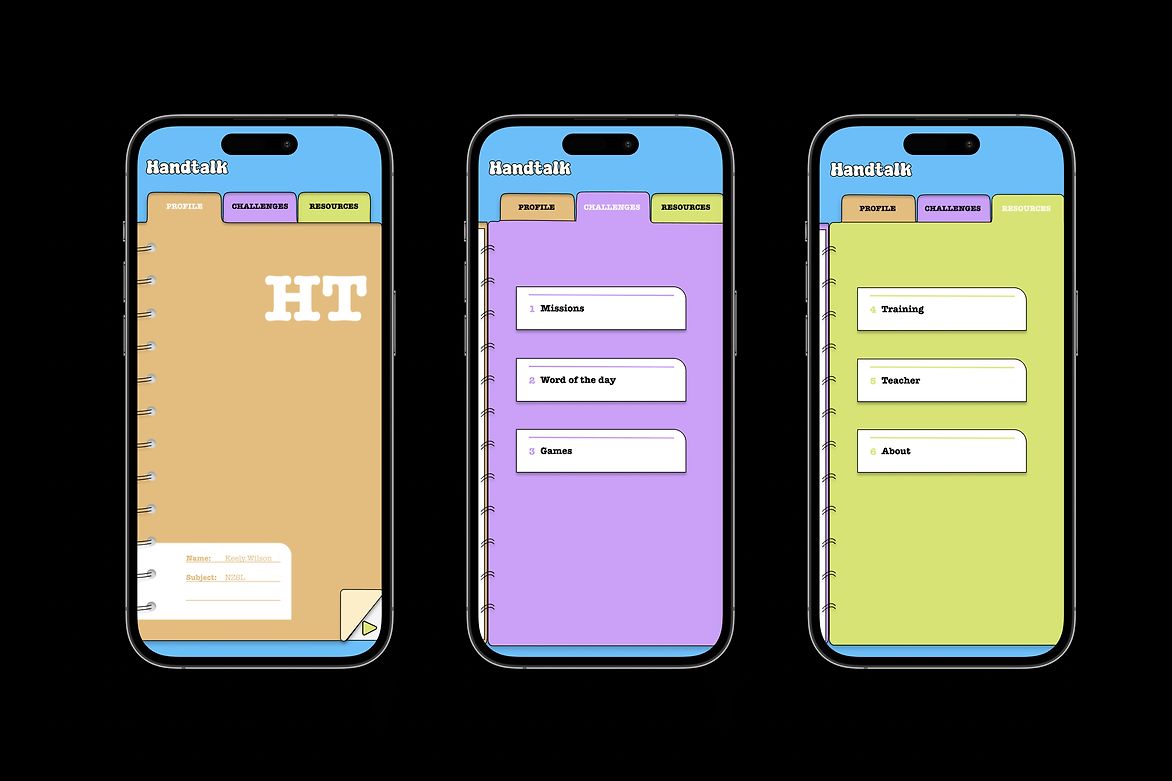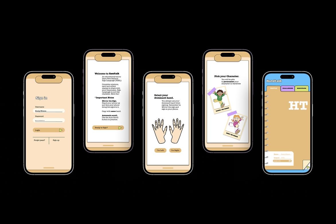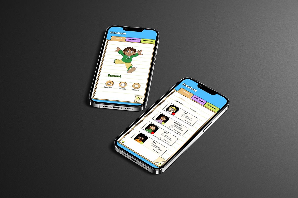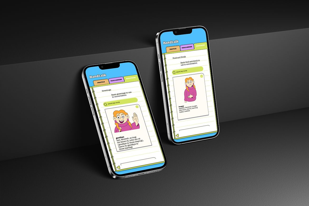 Our analysis led to the development of Handtalk, an app that utilises gamification as a fun and engaging way of learning NZSL. The design features a vibrant brand identity through the use of cartoon illustrations and school stationery items. It includes lively cartoon characters with exaggerated facial features, to highlight the importance of expression in sign language learning.