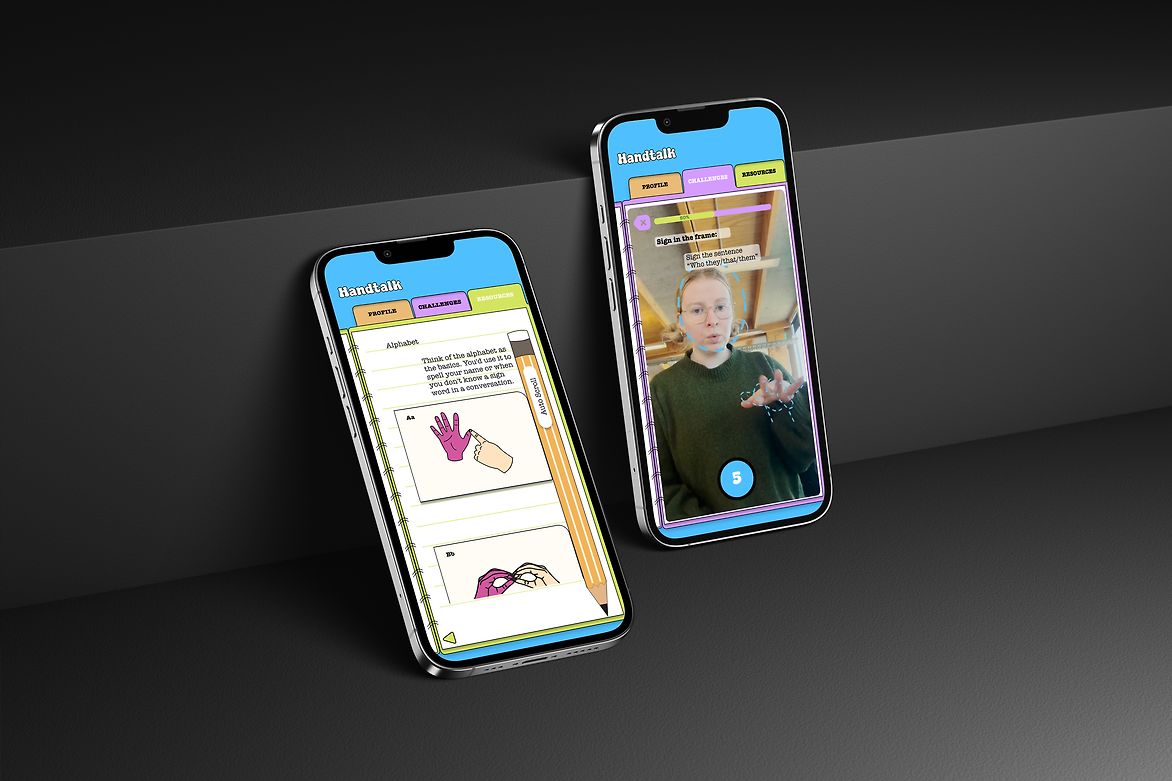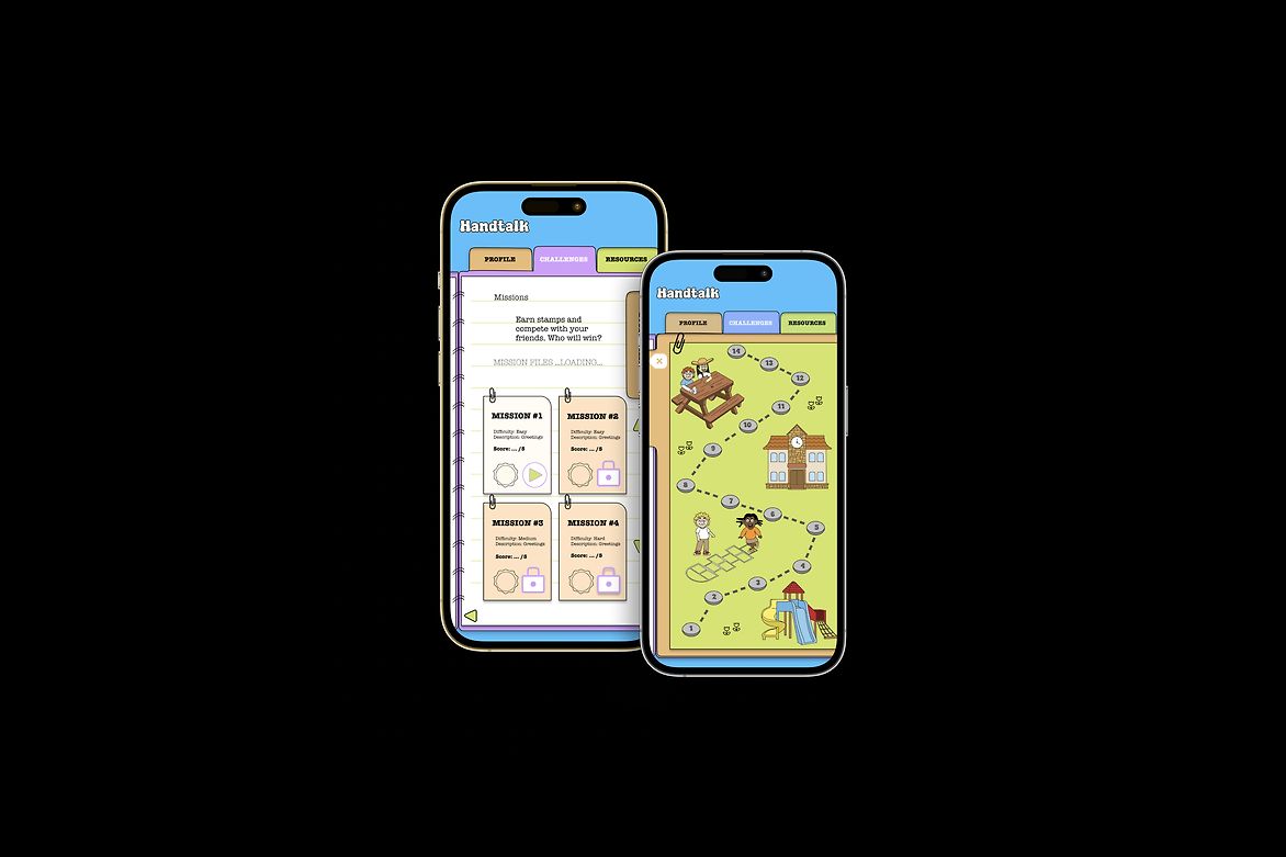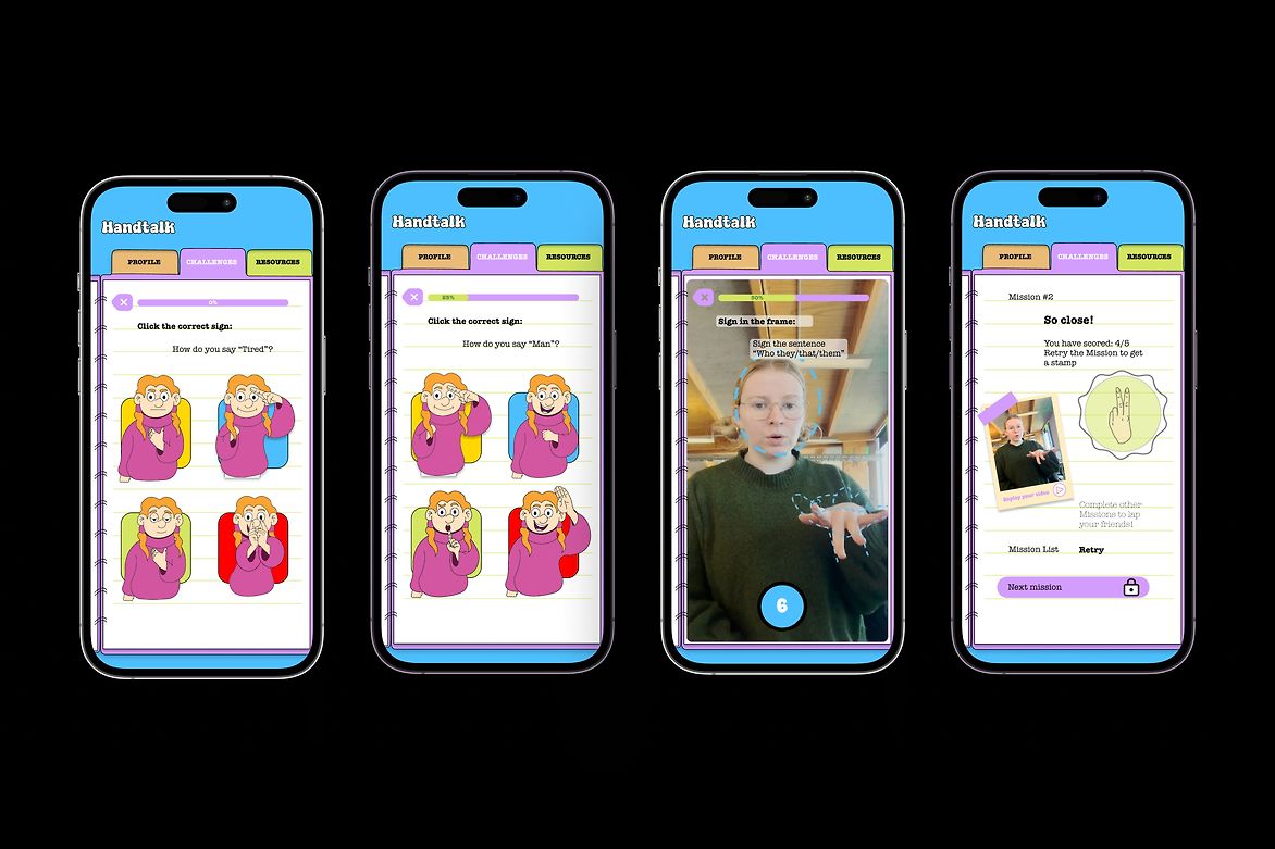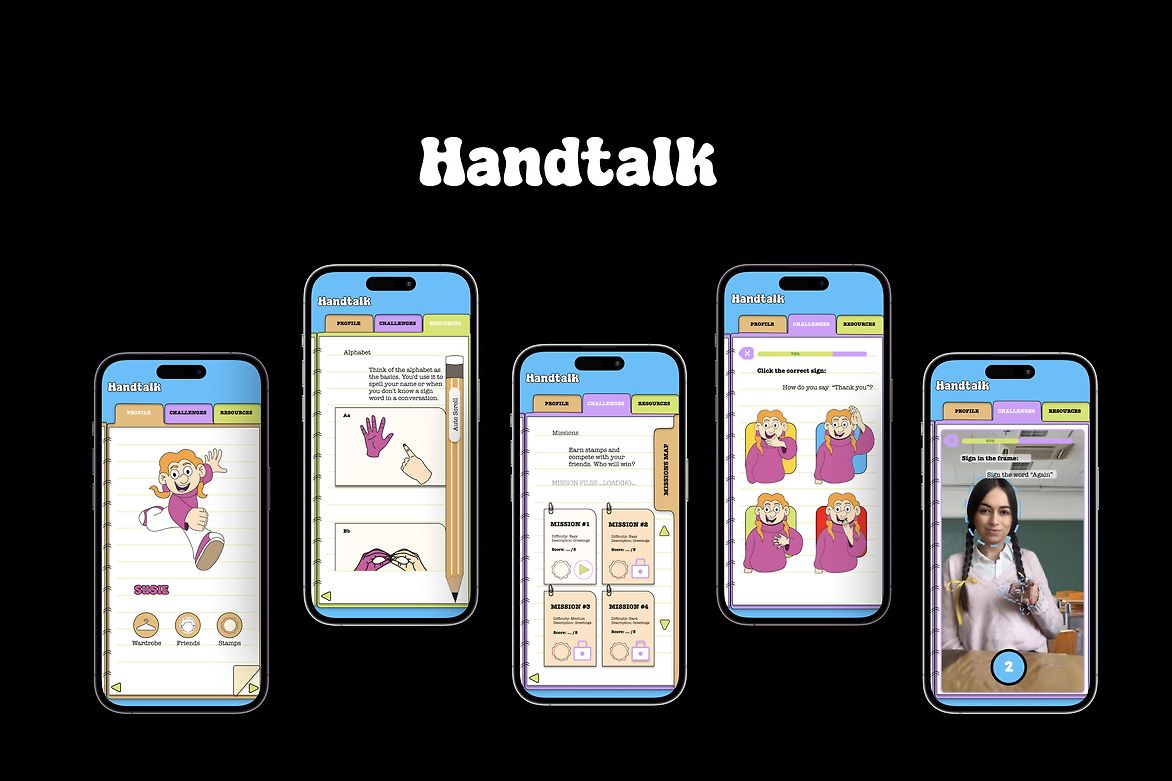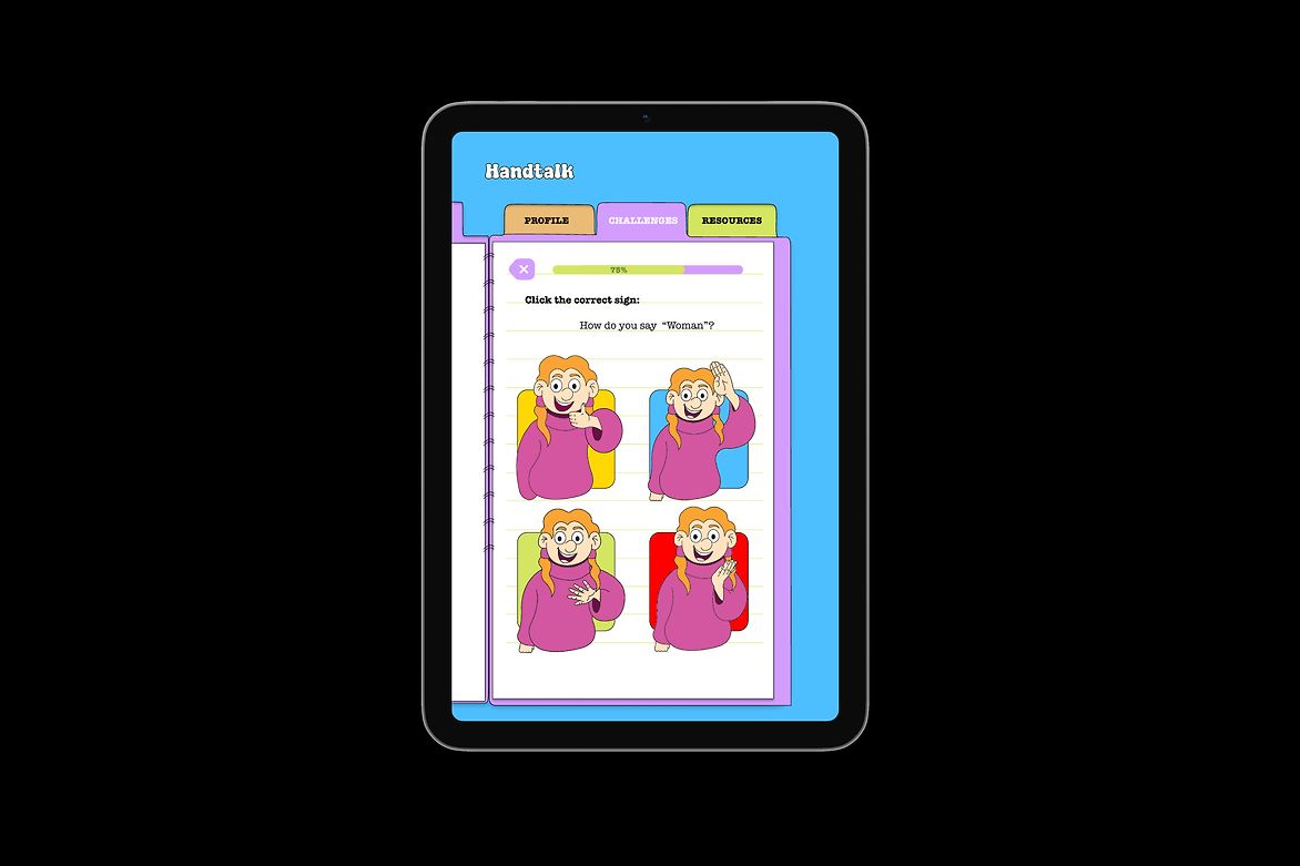 Our analysis led to the development of Handtalk, an app that utilises gamification as a fun and engaging way of learning NZSL. The design features a vibrant brand identity through the use of cartoon illustrations and school stationery items. It includes lively cartoon characters with exaggerated facial features, to highlight the importance of expression in sign language learning.