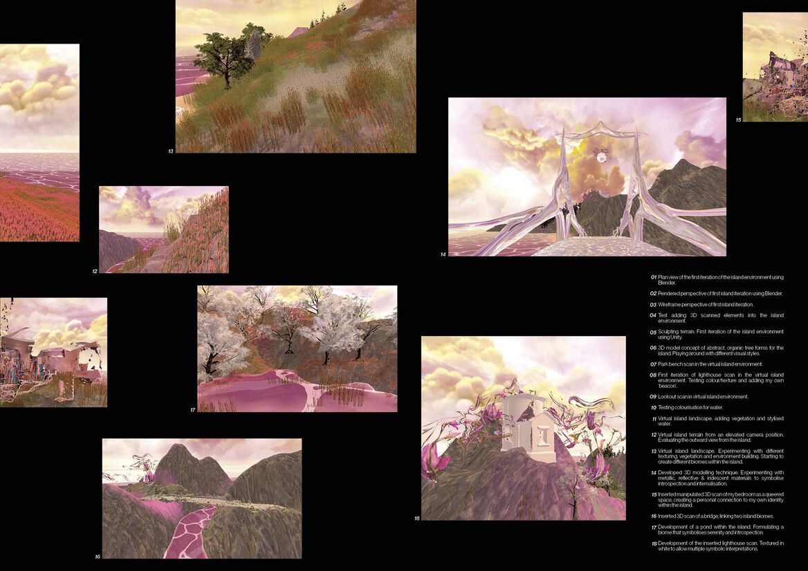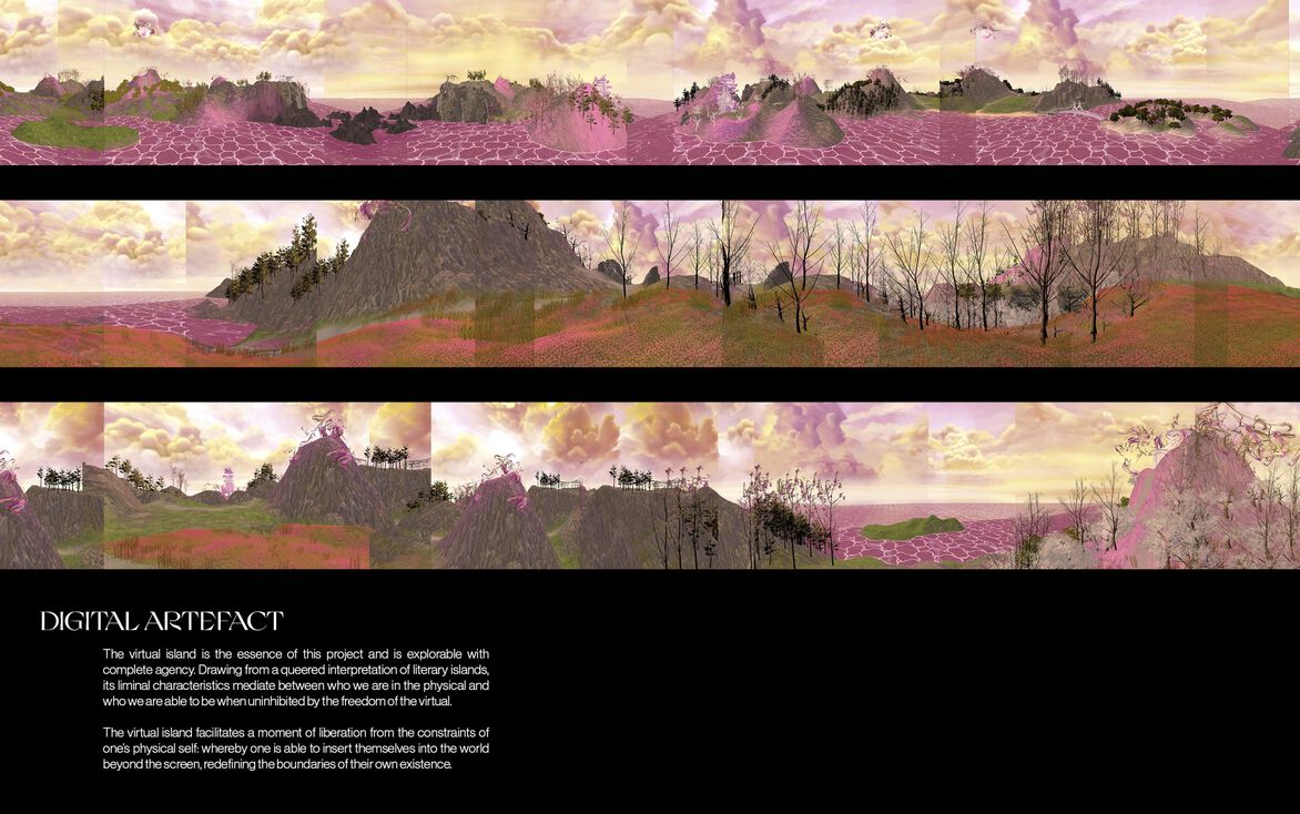 Explorable with complete agency, the virtual island serves as a digital sanctuary from the hegemony of physical space. Drawing from a queered interpretation of literary islands, its liminal characteristics mediate between who we are in the physical and who we are able to be when uninhibited by the freedom of the virtual.