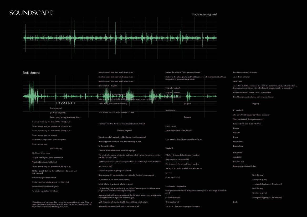 The soundscape is the interweaving constant between physical and virtual, moving seamlessly and illusively between and within the two spaces.