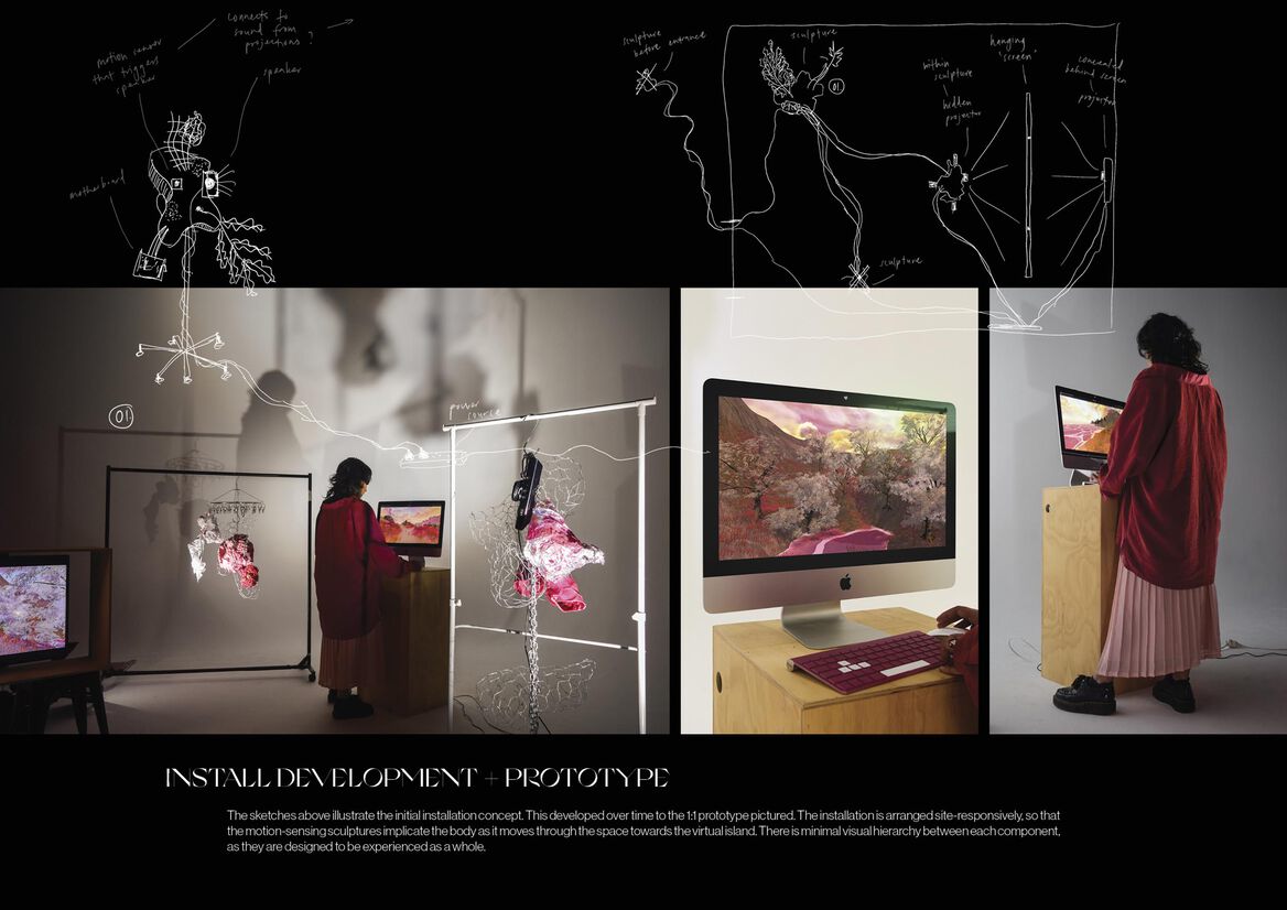 The installation prototype is arranged site-responsively, so that the motion-sensing sculptures implicate the body as it moves through the space towards the virtual island. There is minimal visual hierarchy between each component, as they are designed to be experienced as a whole.