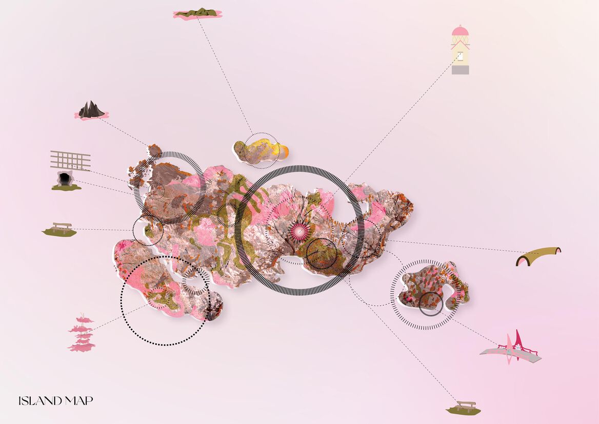 The map has been used as a tool to visually communicate these landmarks, and their positionings within the context of the virtual island space. It highlights various points of interest without suggesting or delineating a specific path one must take.